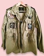 Dieser Vintage Parka besteht aus olivgrüner Baumwolle. Handbemalt und verziert mit stencil(s)/ Siebdrucken und Patches. 1x verfügbar in Grösse XL (fällt grosszügig aus)