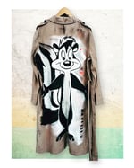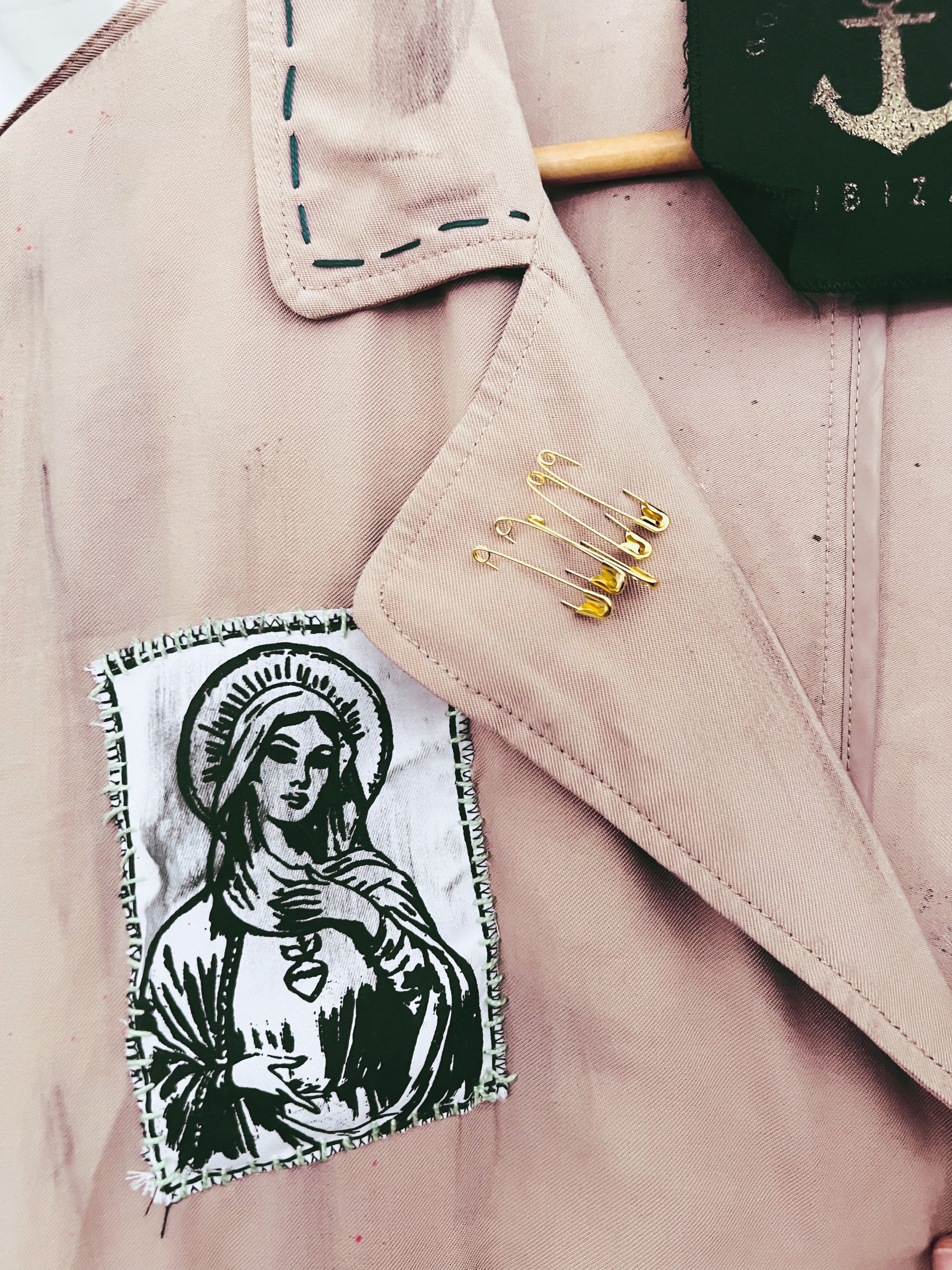 Dieser leichte Vintage Trenchcoat besteht aus beigefarbener, weich fallender Baumwolle. „ Handbemalt und verziert mit stencil(s)/ Siebdrucken und Patches. MADE WITH PASSION IN IBIZA ♻️