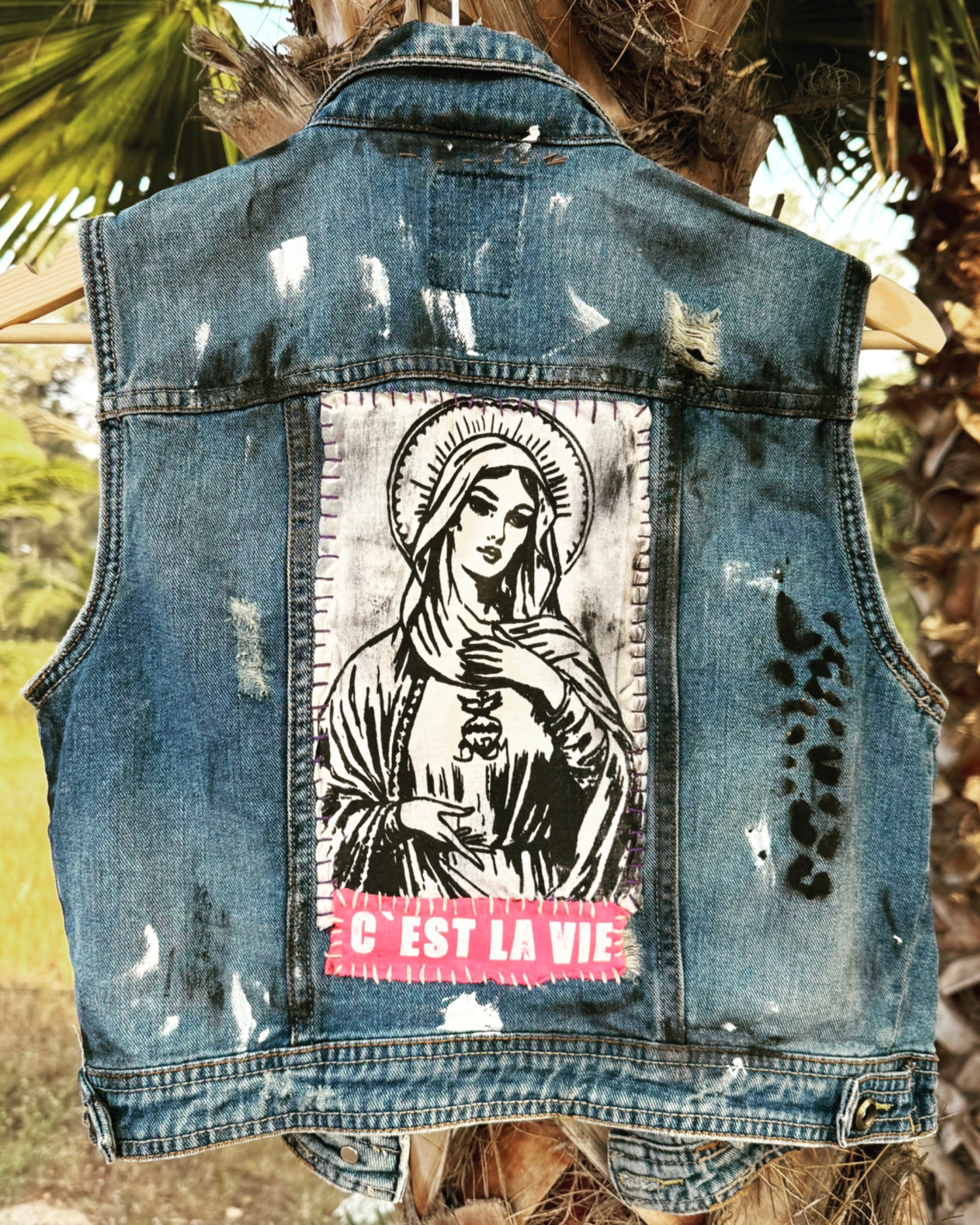 Auf der Rückseite der Denim Weste dominiert ein großer -Patch –. Ergänzt wird das Design durch handgesetzte Spray-und Siebdruck Elemente „Jedes Detail ist bewusst unperfekt und unterstreicht den individuellen Charakter.