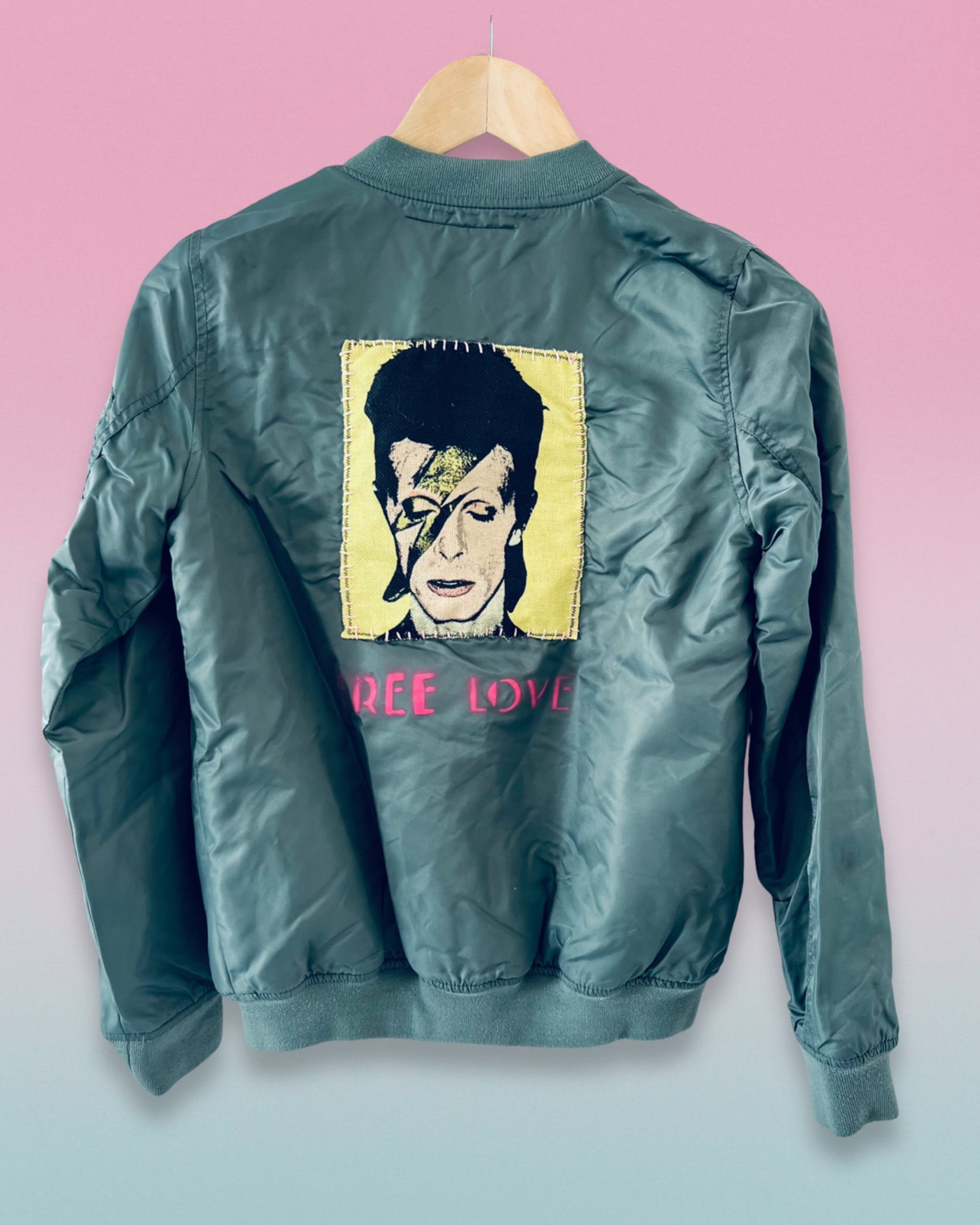 Leichte Vintage Bomberjacke - verziert mit stencils/ Siebdrucken und Patches. MADE WITH PASSION IN IBIZA ♻️