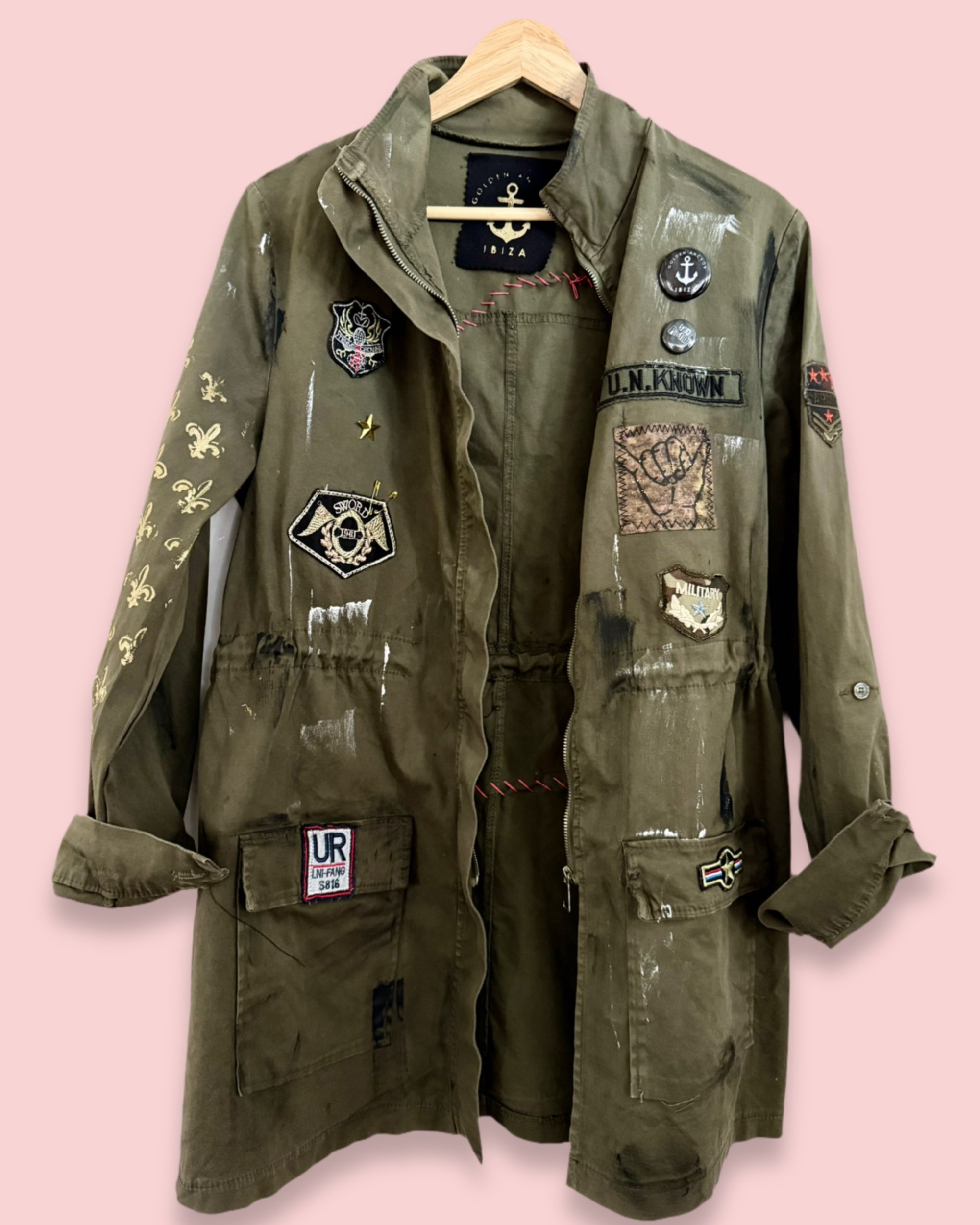 Dieser Vintage Parka besteht aus dünner olivgrüner Baumwolle (ungefüttert). Handbemalt und verziert mit stencil(s)/ Siebdrucken und Patches. 1x verfügbar in Grösse XS-S