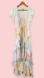Dieses lange Volantkleid besteht aus feiner Baumwolle mit dezent eingewebtem Silber-Lurexfaden. Zarte Spitzenabschlüsse entlang der offenen Front und an den Volants unterstreichen den femininen, verspielten Charakter.