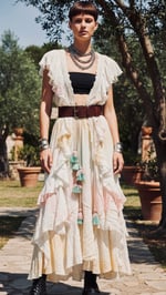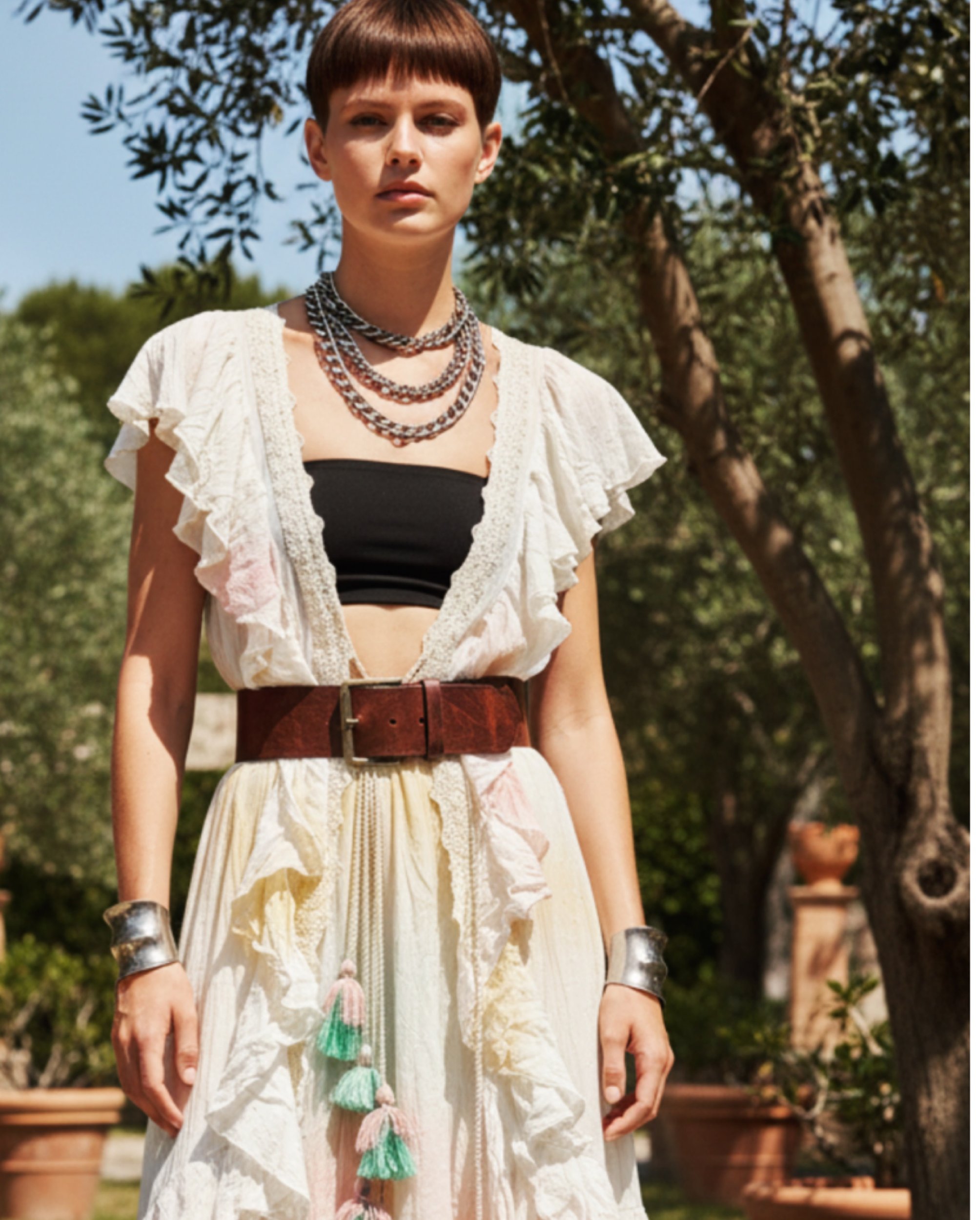 Die mehrstufigen Volants sorgen für Bewegung und Volumen, ohne schwer zu wirken. Ideal für Sommer, Strand, Events oder als Statement-Piece im Alltag.