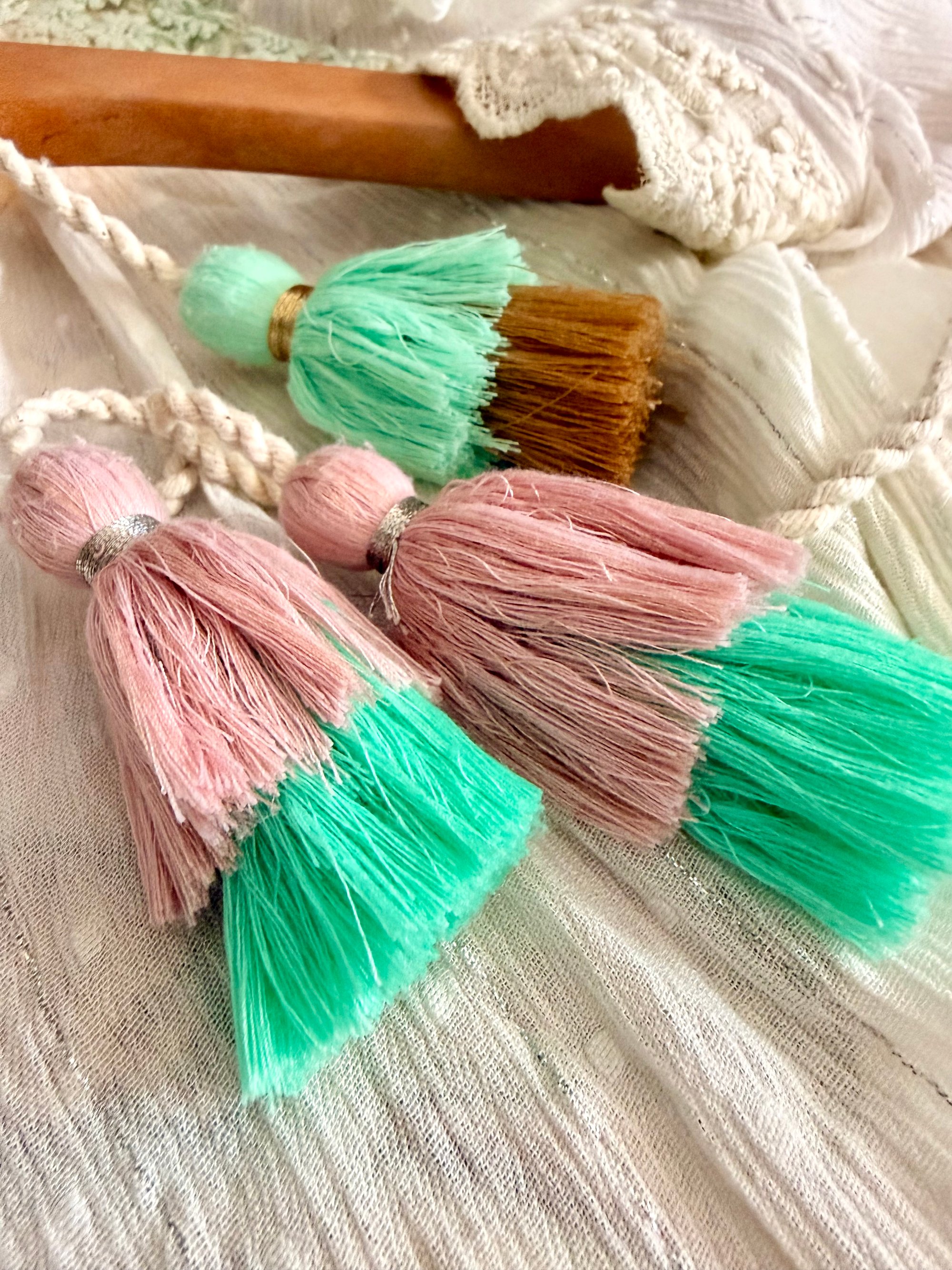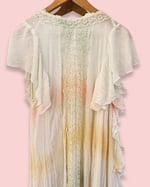 Das Kleid ist handgefärbt und zeigt sanfte Farbverläufe in warmen Creme-, Rosé- und Sonnentönen – jedes Stück wirkt dadurch individuell.