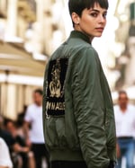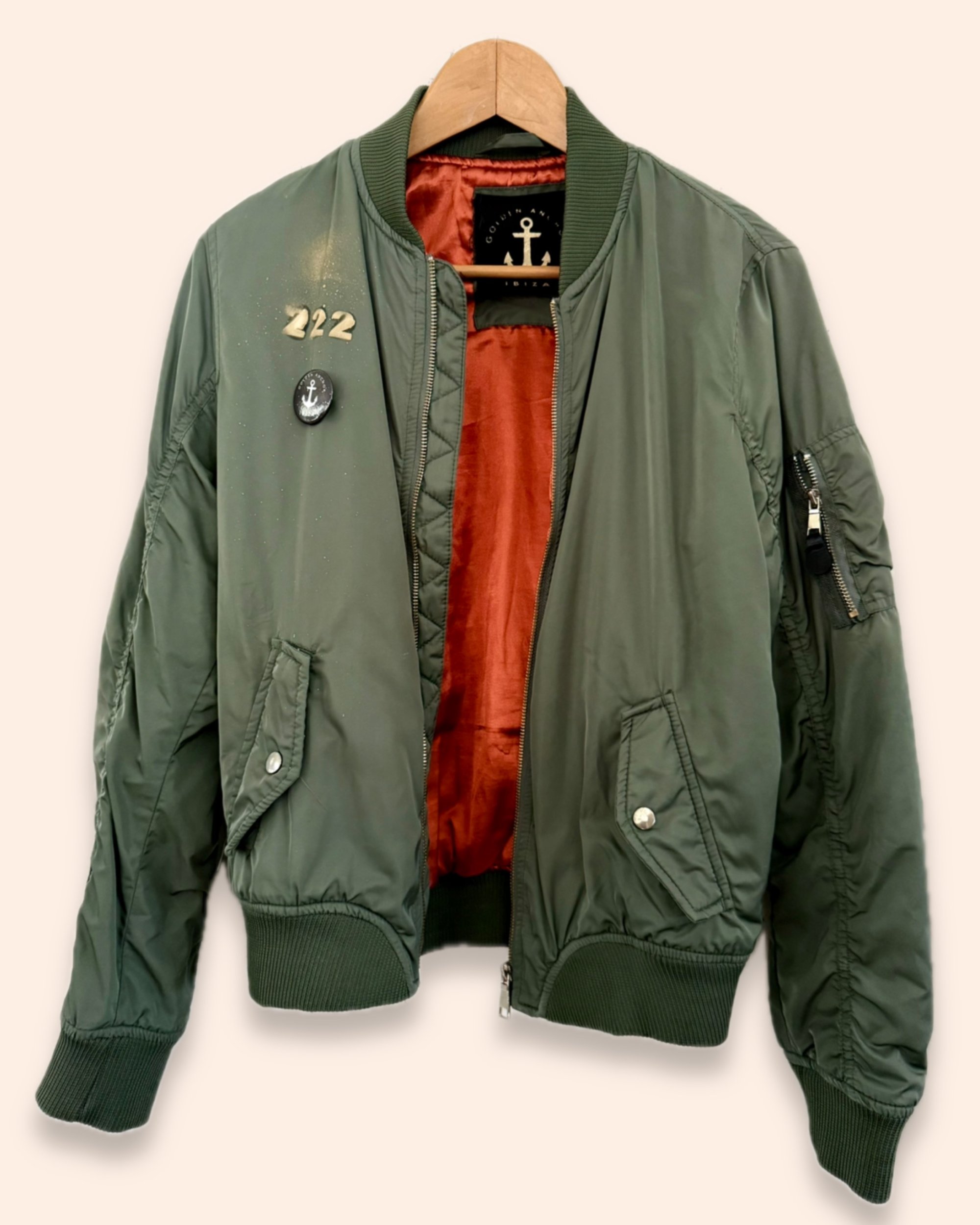 Diese grüne Vintage-Bomberjacke wurde auf Ibiza von Hand veredelt und trägt auf dem Rücken ein kraftvolles Ganesha-Motiv in Gold. Der Patch ist bewusst roh eingefasst, mit auffälligen Kontraststichen von Hand aufgenäht, und geben der Jacke einen typischen urbanen, unperfekt Look.