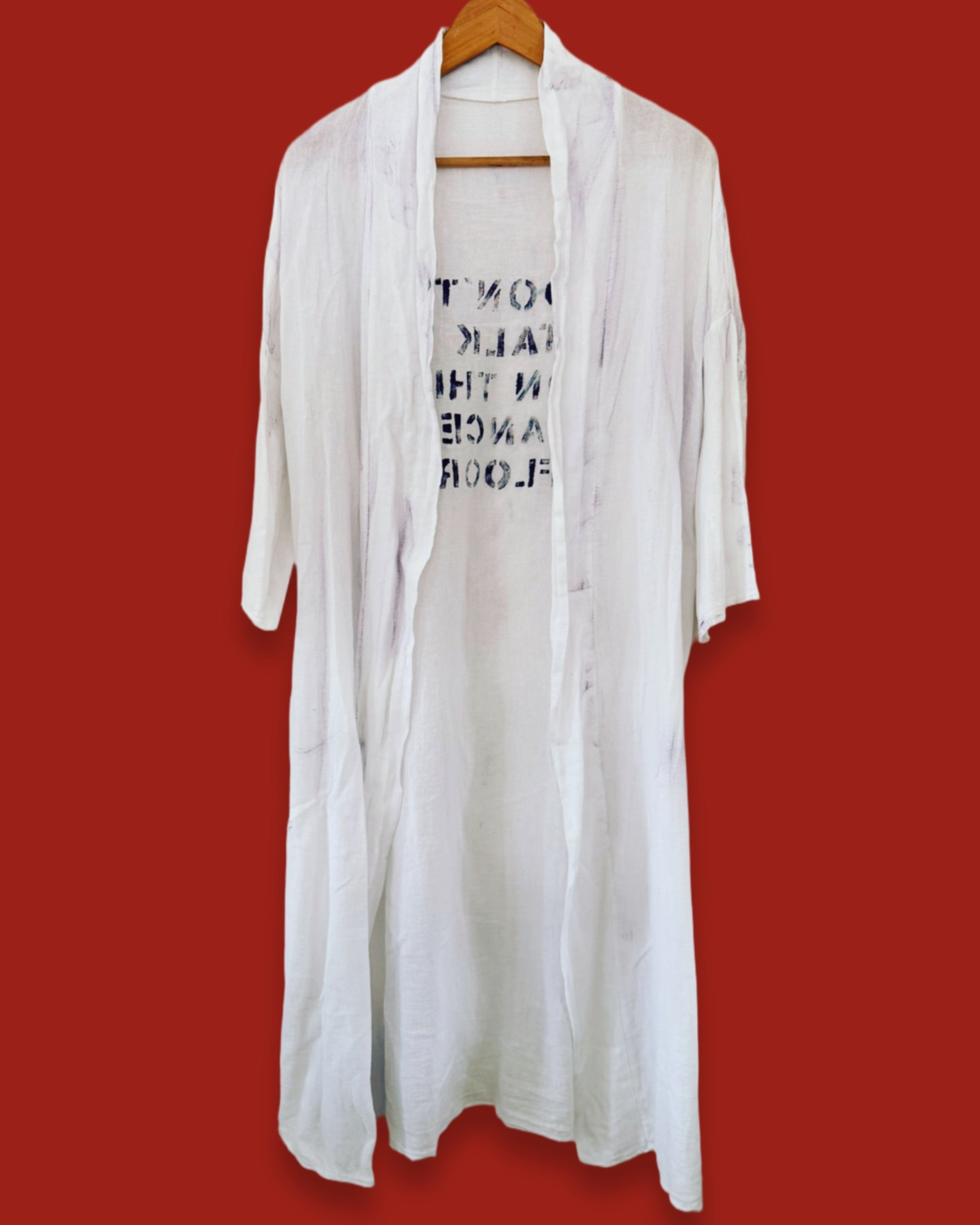 Lange, offene Baumwolljacke in weiss, handgefärbt mit lebendiger, leicht unregelmäßiger Struktur. Der Schnitt ist gerade und fließend,. Die Länge reicht deutlich über das Knie und sorgt für eine klare, lange Silhouette. Offen getragen entsteht ein ruhiger, markanter Fall – zwischen Kimono und leichter Manteljacke.