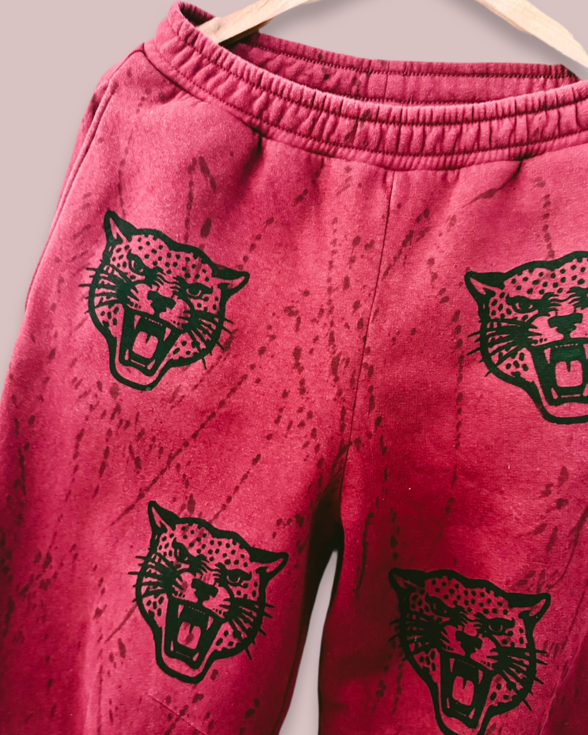 Der Schnitt ist bewusst besonders: keine klassische, gerade Sweatpants-Form, sondern leicht rund gearbeitet mit subtiler Weite an den Seiten. Sie verläuft weich nach unten und sitzt entspannt auf dem Knöchel. Dadurch entsteht eine lässige Silhouette. Allover mit schwarzen Panther-Prints versehen, kombiniert mit unregelmäßigen Farbspritzern. Ein Piece zwischen Street, 90s-Vibe und Punk-Attitude. Passend M/L