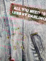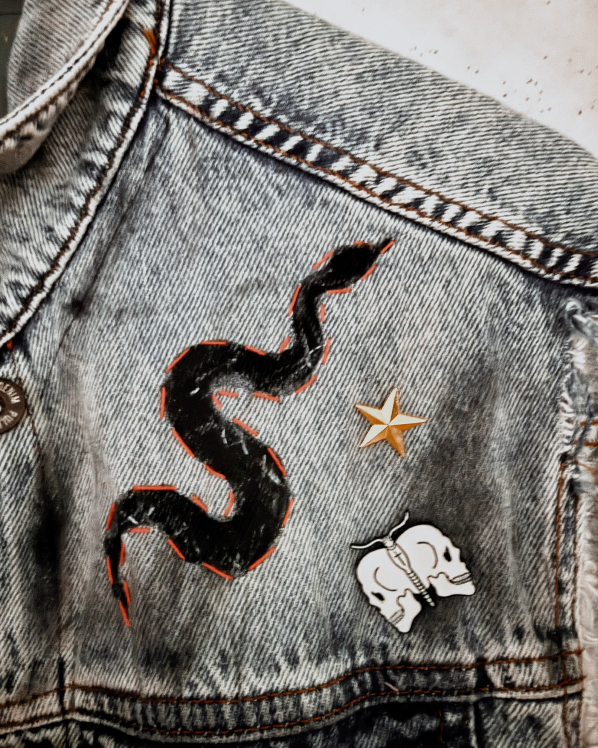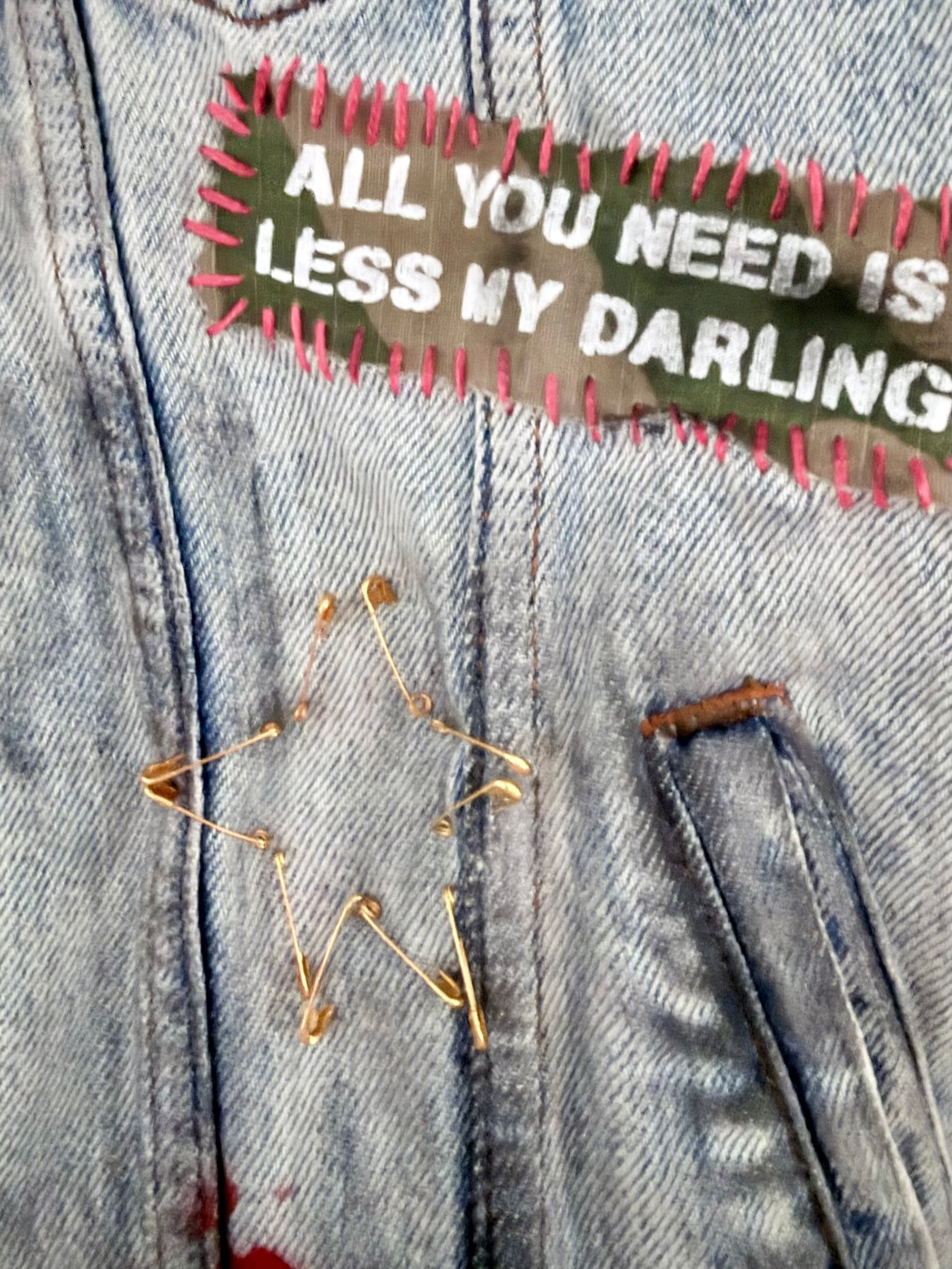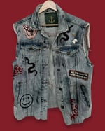 Die Vorderseite ist eine Mischung aus Patches, Pins und Malerei: Smiley, Schlange, Sterne, kleine grafische Elemente und ein gesticktes Statement-Patch. Fransen an den Ärmeln und am Saum geben der Weste diesen typischen, lässigen Festival-Vibe.