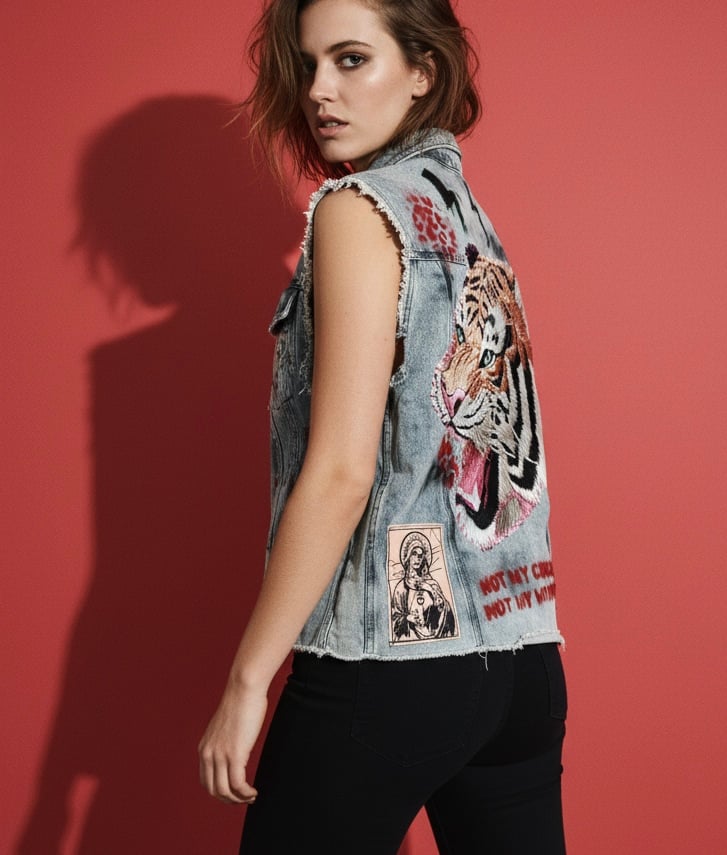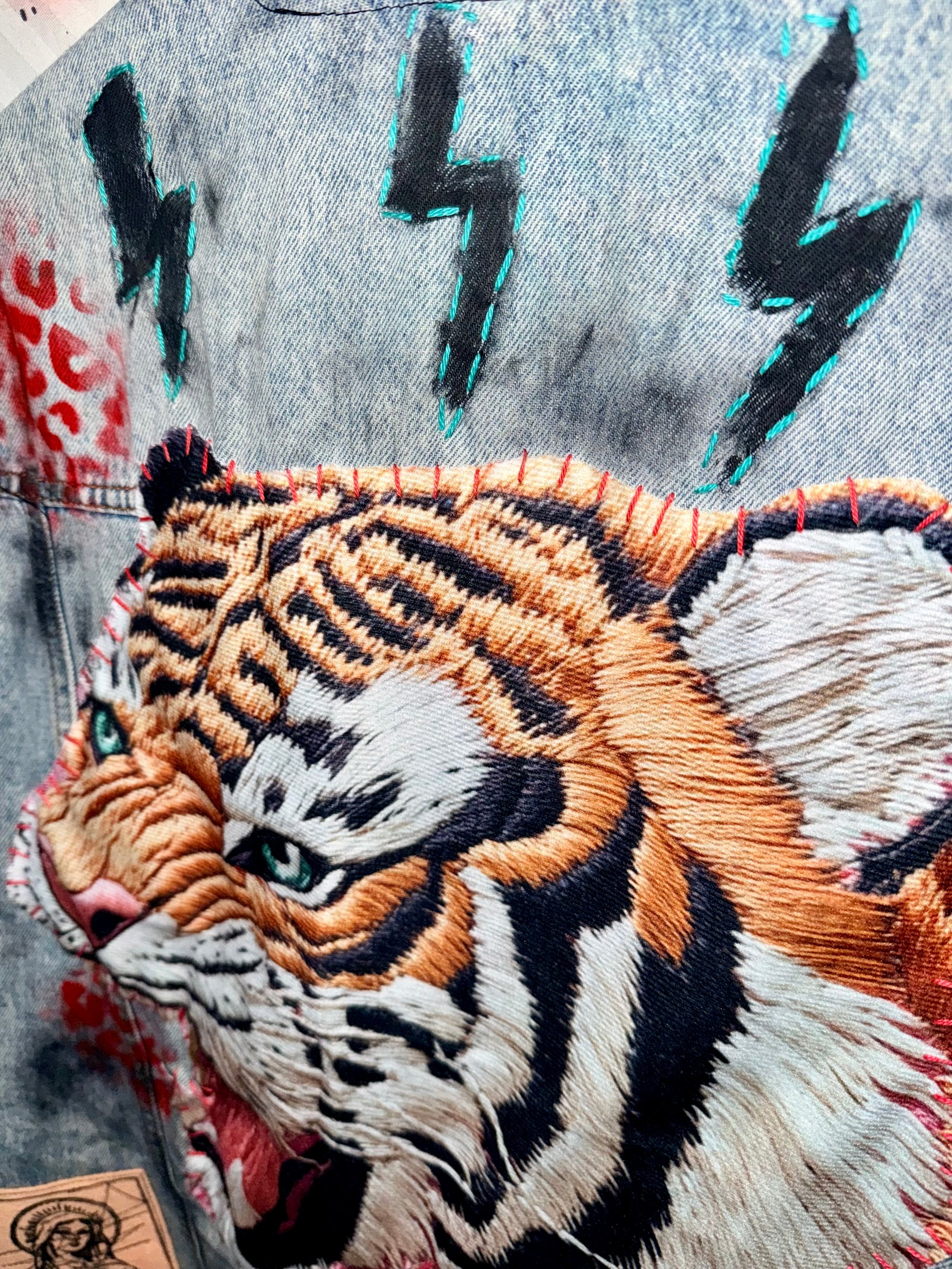 Auf der Rückseite de denim Weste dominiert ein großer Tiger-Patch –. Ergänzt wird das Design durch handgesetzte Spray-und Siebdruck Elemente „Jedes Detail ist bewusst unperfekt und unterstreicht den individuellen Charakter.