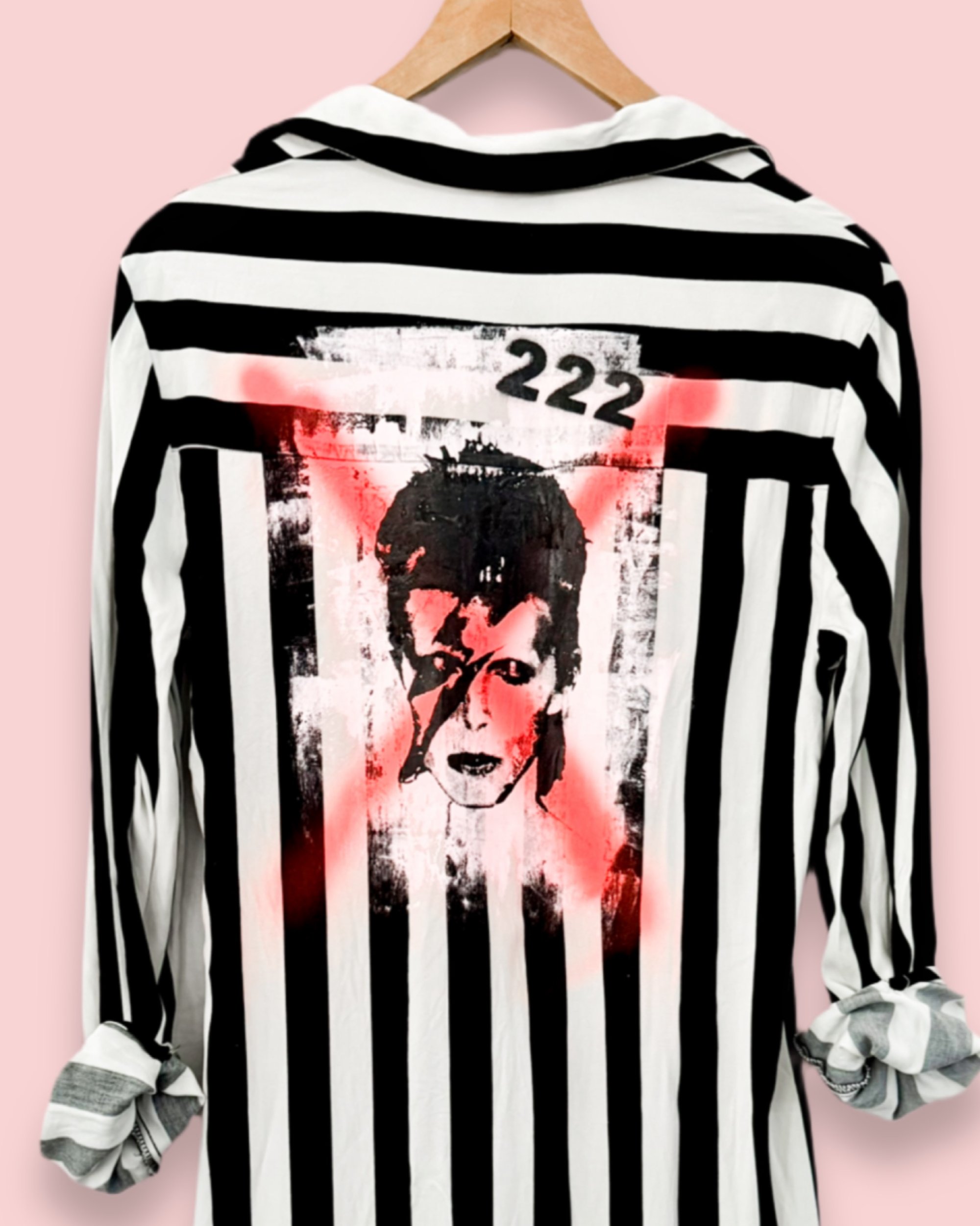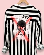 Vorne klassisch gestreift, hinten mit markantem Statement-Backprint „222“ und Portrait-Motiv – ein klarer Eyecatcher mit Charakter.