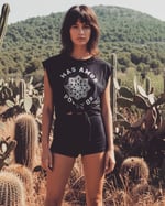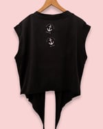 Schwarzes, ärmelloses Top im lässigen Oversize-Schnitt mit dekorativ gekrempelten Schultern. Vorne mit großem, weißem Print „Mas Amor Por Favor“ und ornamentalem Mandala-Motiv. Hinten mit doppeltem Golden Anchor Ibiza Anker-Logo im Nackenbereich.
