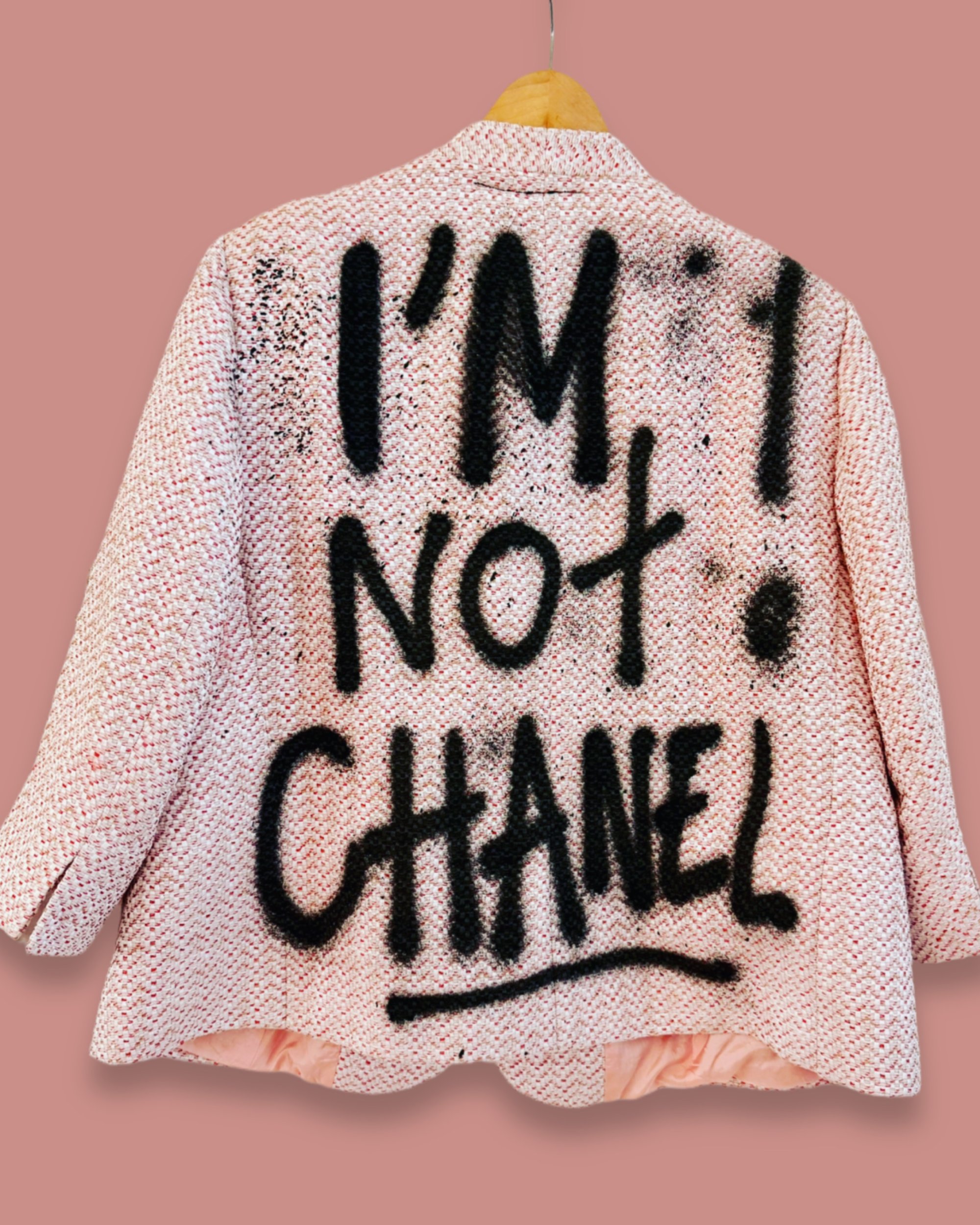Ein klassischer Tweed-Blazer in Rosa,/ Schnitt: Locker,, 3/4 Ärmel- mit Street-Art-Twist. Die Vorderseite elegant und die Rückseite mit handgesprühten Statement.