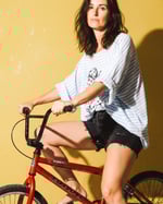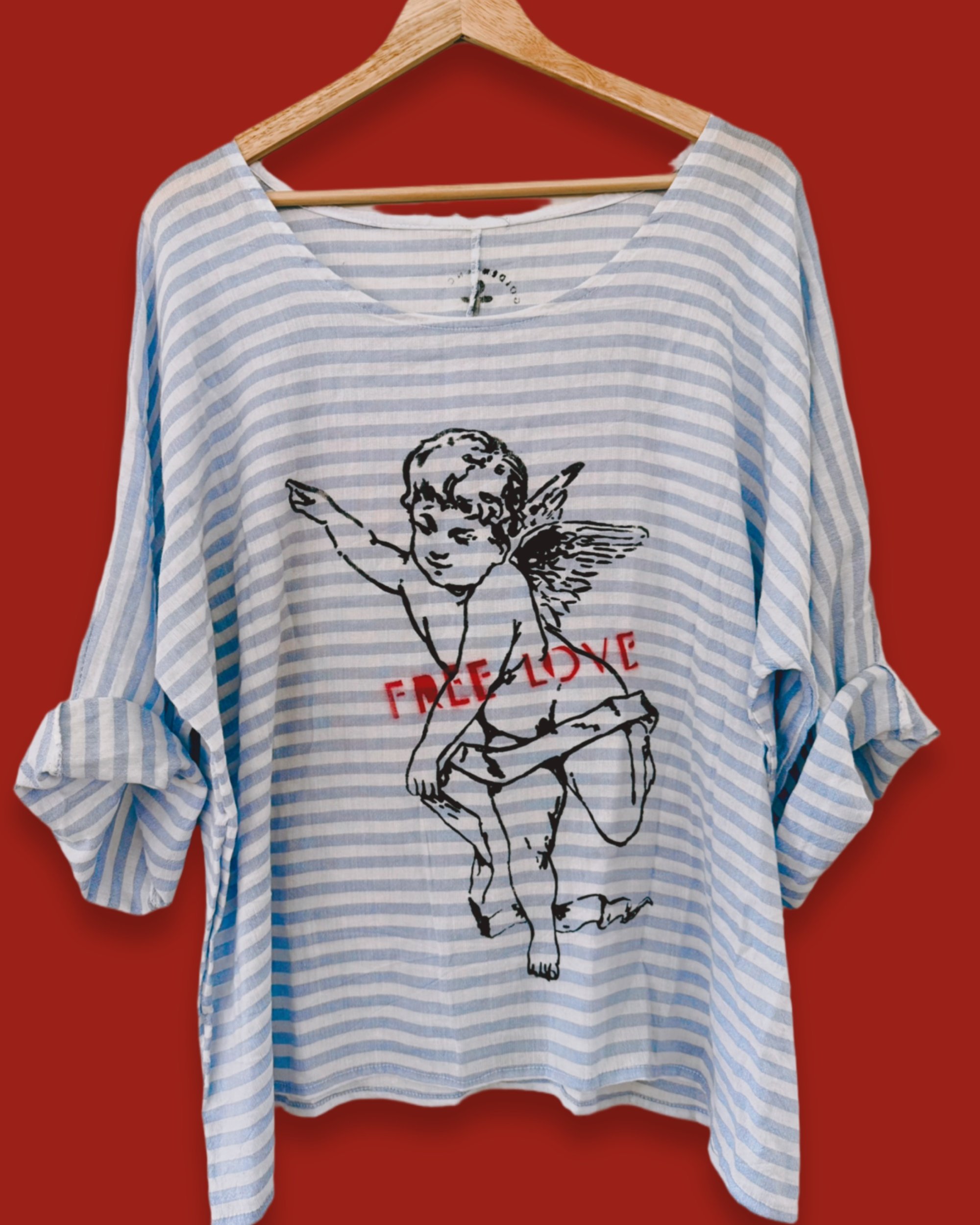 Luftige weiss/hellblau gestreifte Baumwolle, weit geschnitten. Vorderseitig grosser Print. 1x verfügbar -passend M-L
