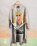 Dieser leichte Vintage Trenchcoat besteht aus beigefarbener, weich fallender Baumwolle. „ Handbemalt und verziert mit stencil(s)/ Siebdrucken und Patches. MADE WITH PASSION IN IBIZA ♻️