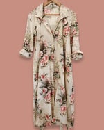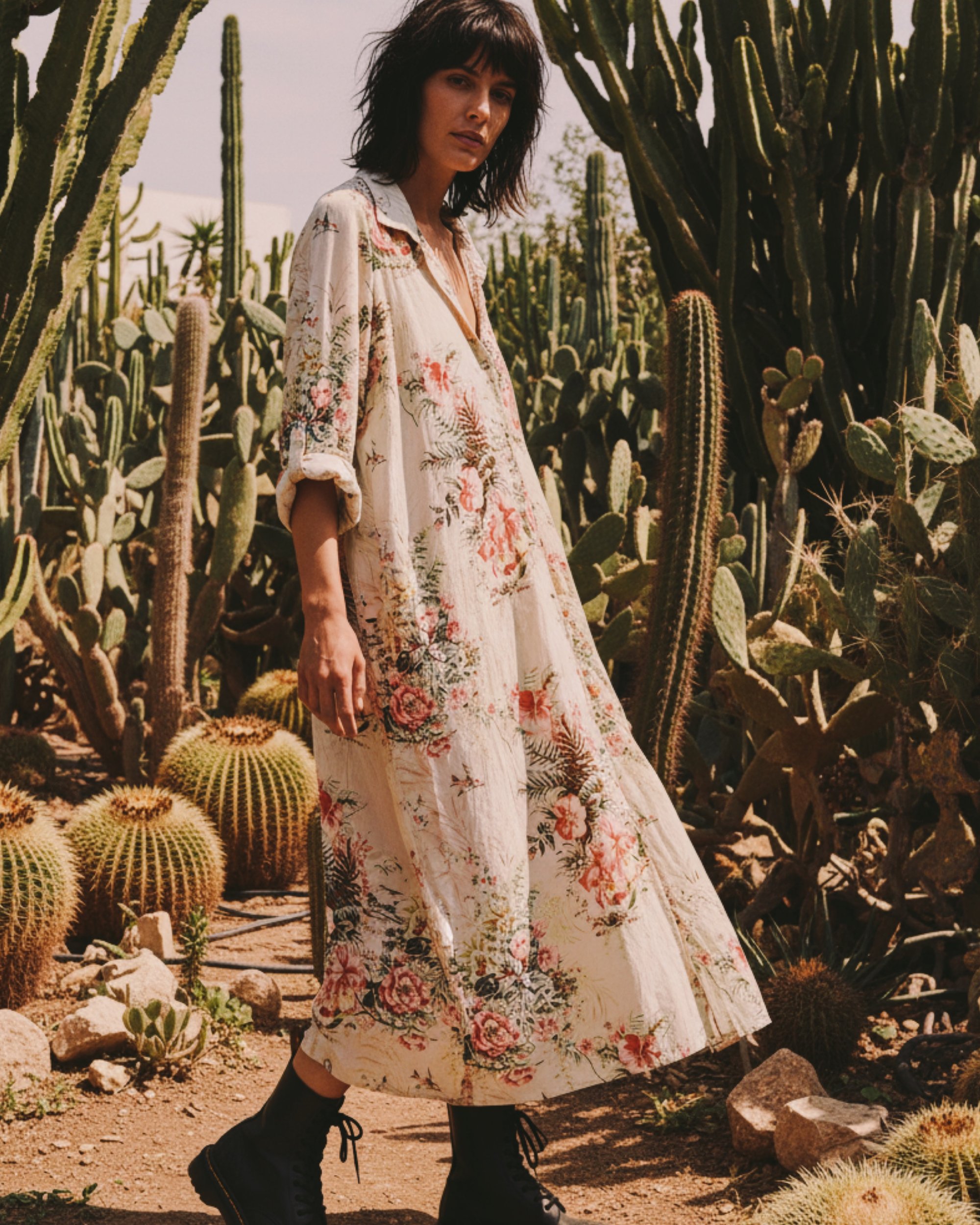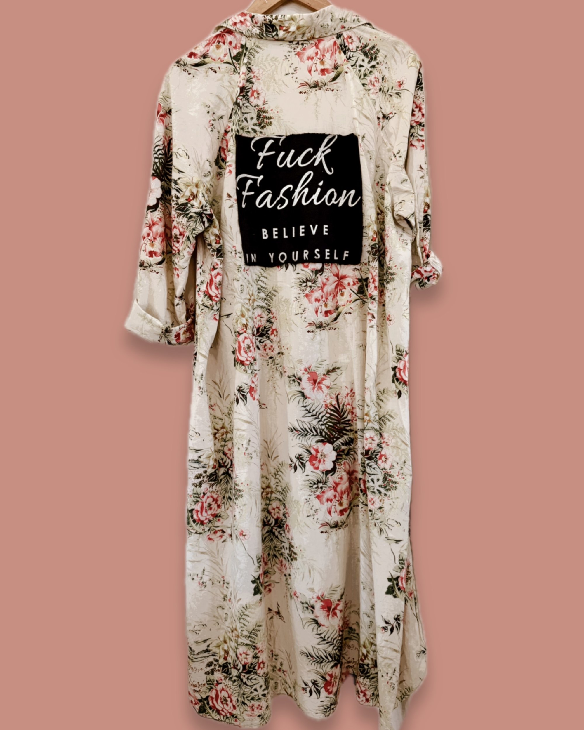 Leichtes Vintage Hemdkleid aus dünner, weich fallender Baumwolle mit floralem Allover-Print. Locker geschnitten, durchgehende Knopfleiste und aufgekrempelte Ärmel für einen entspannten Look. Auf der Rückseite ein aufgenähter Statement-Patch „Fuck Fashion – Believe in Yourself“.