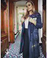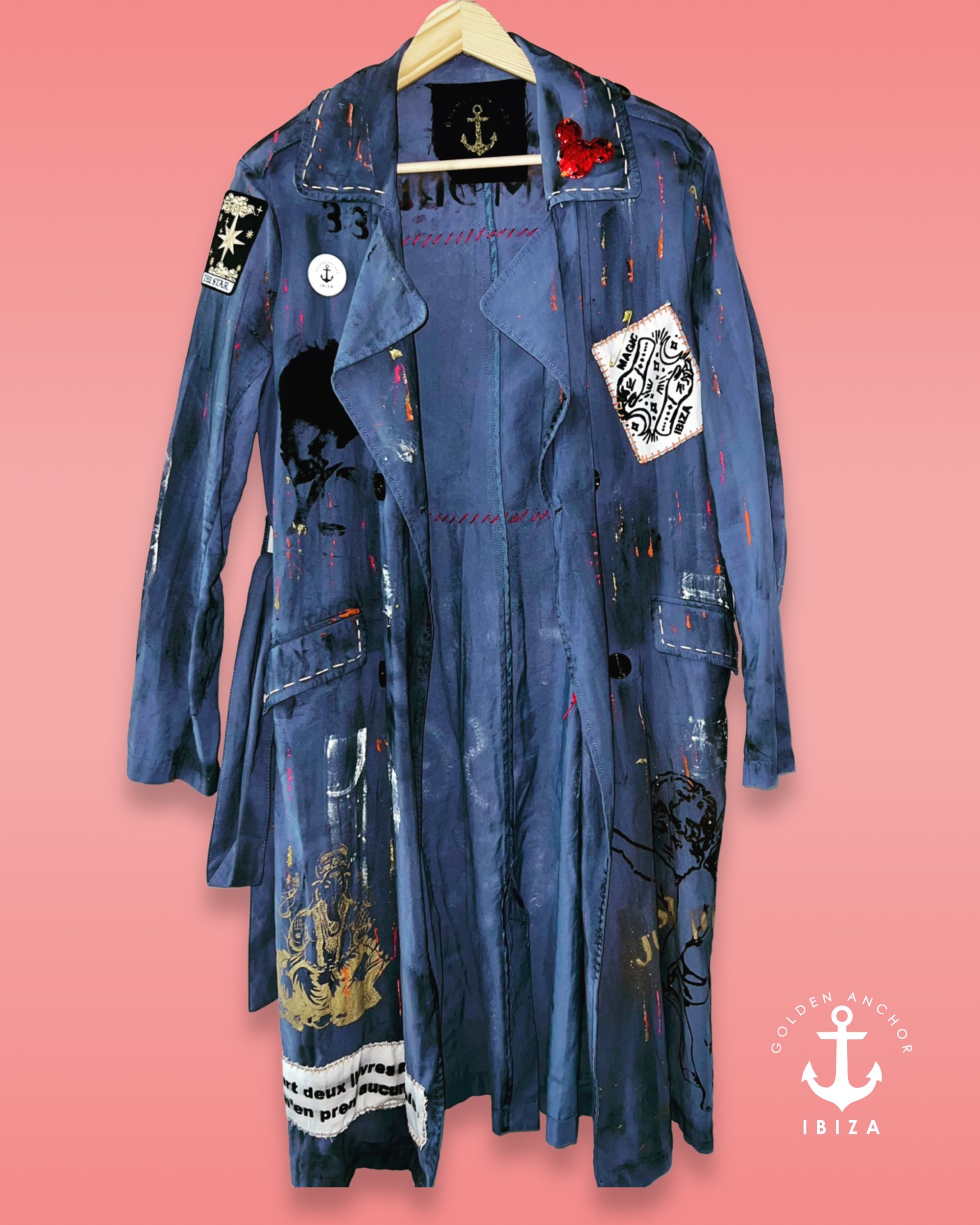 Dieser leichte Vintage Trenchcoat besteht aus graublauer, weich fallender Baumwolle. „ Handbemalt und verziert mit stencil(s)/ Siebdrucken und Patches. MADE WITH PASSION IN IBIZA ♻️