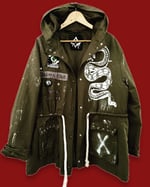 Dieser Vintage Parka besteht aus leichter olivgrüner Baumwolle (ungefüttert). Handbemalt und verziert mit stencil(s)/ Siebdrucken und Patches. 1x verfügbar in Grösse M-L