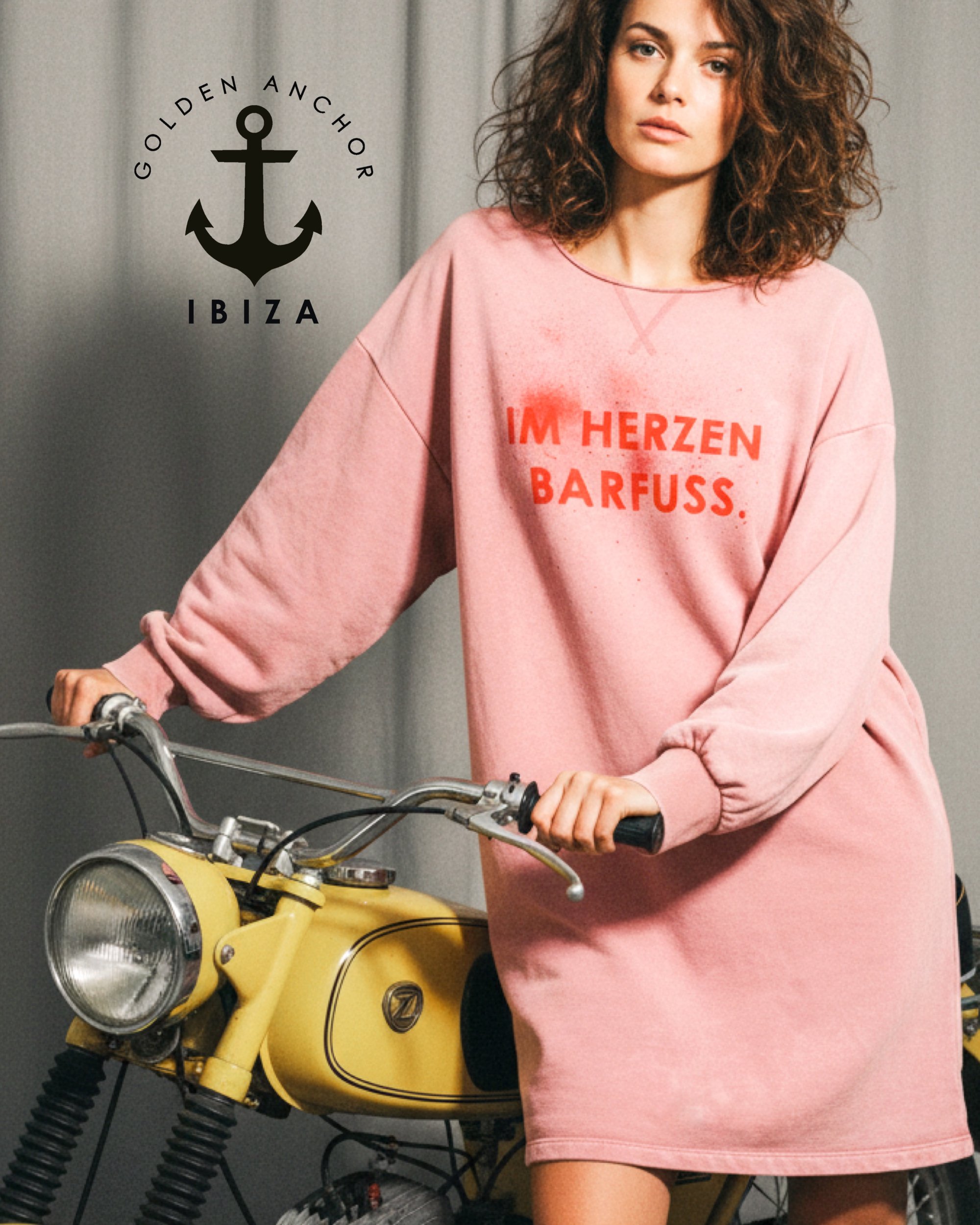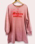 Der Frontprint „IM HERZEN BARFUSS “ ird durch handgesetzte Farbspritzer ergänzt und bekommt so eine rohe, individuelle Note.