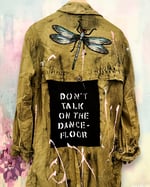 Dieser leichte Vintage Mantel besteht aus olivgrüner, weich fallenden Leinen. „ Handbemalt und verziert mit stencil(s)/ Siebdrucken und Patches.
