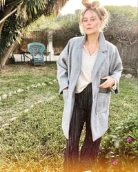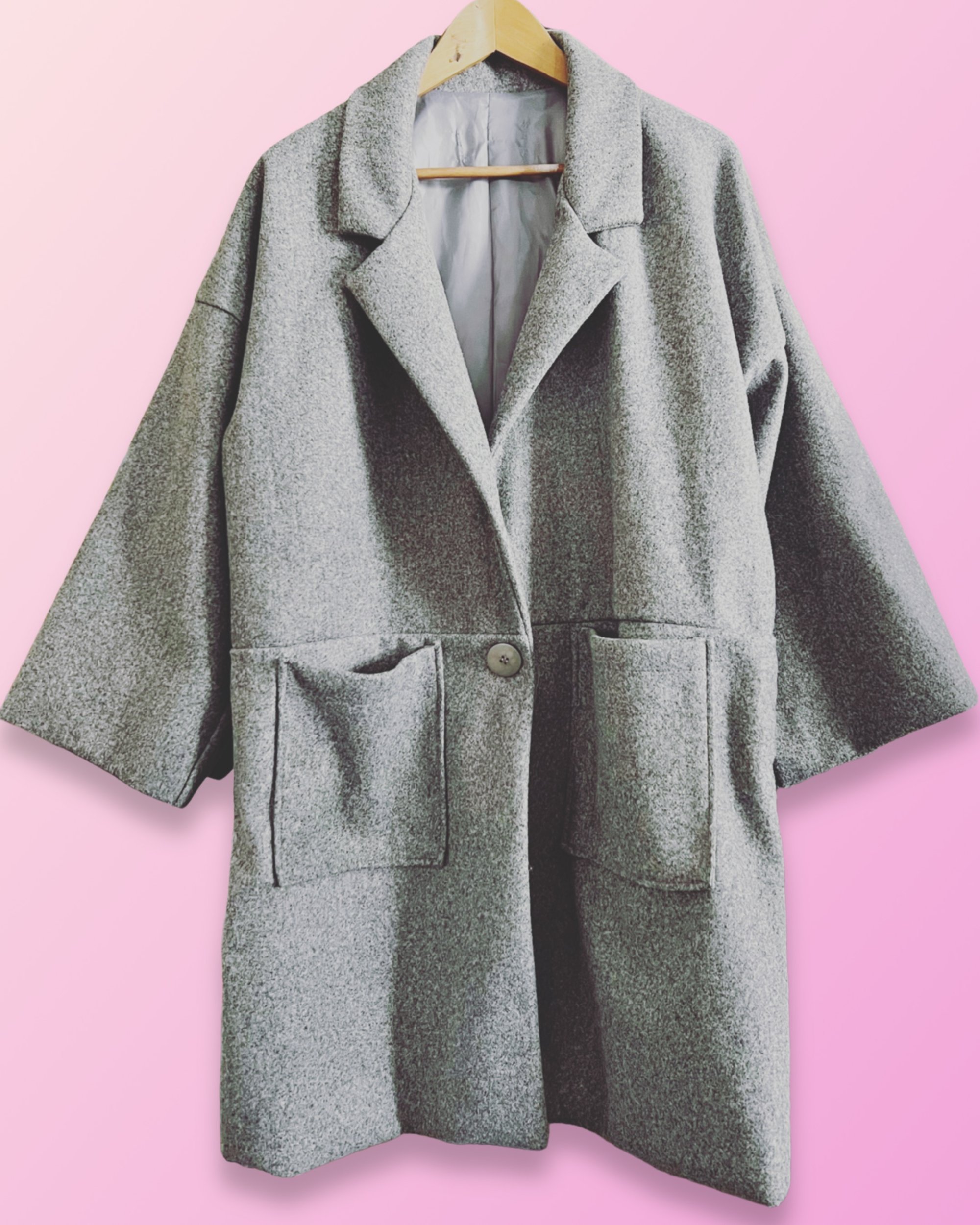 Dieser warme Vintage Mantel besteht aus grauem Filz. 3/4 Arm. Verziert mit stencil(s)/ Siebdrucken und Patches.