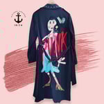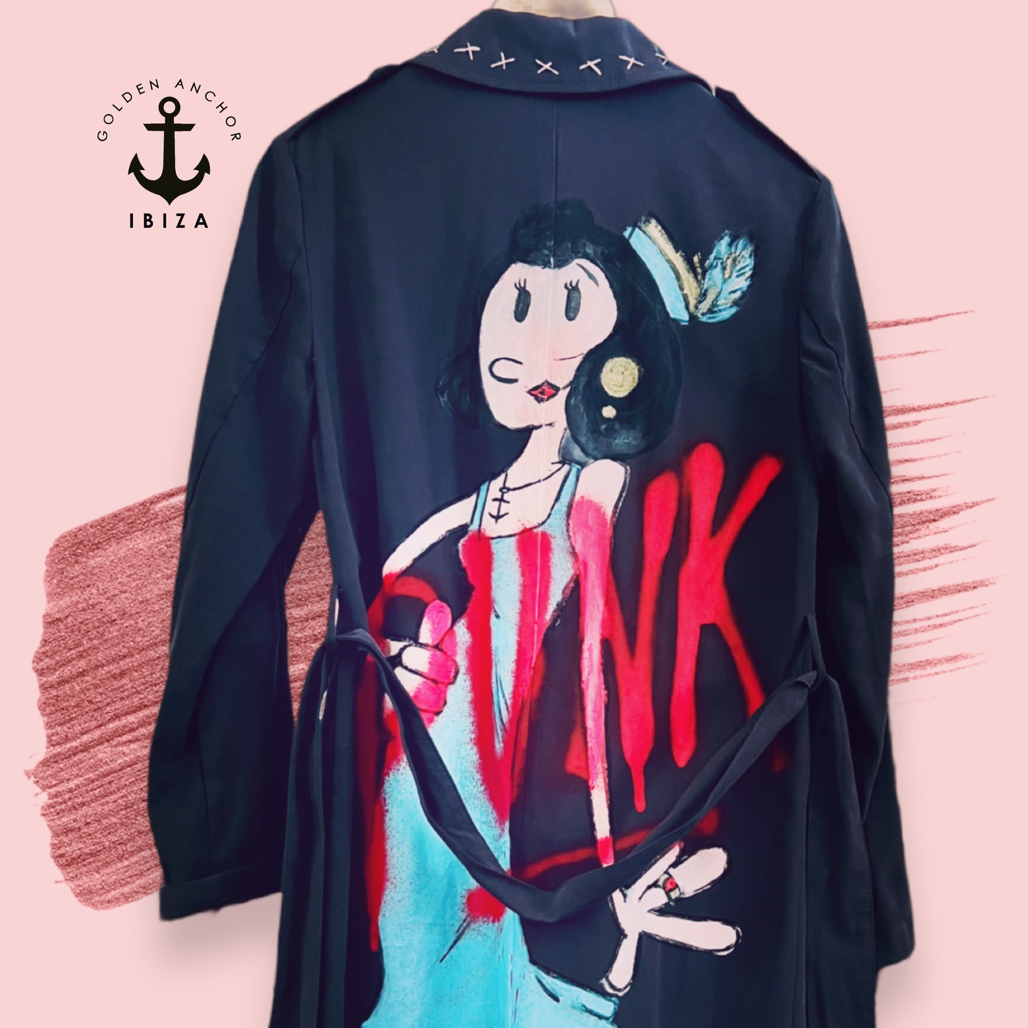 Der leichte Vintage Trenchcoat besteht aus schwarzer, weich fallender Baumwolle. Handbemalt und verziert mit stencils/ Siebdrucken und Patches. MADE WITH PASSION IN IBIZA ♻️