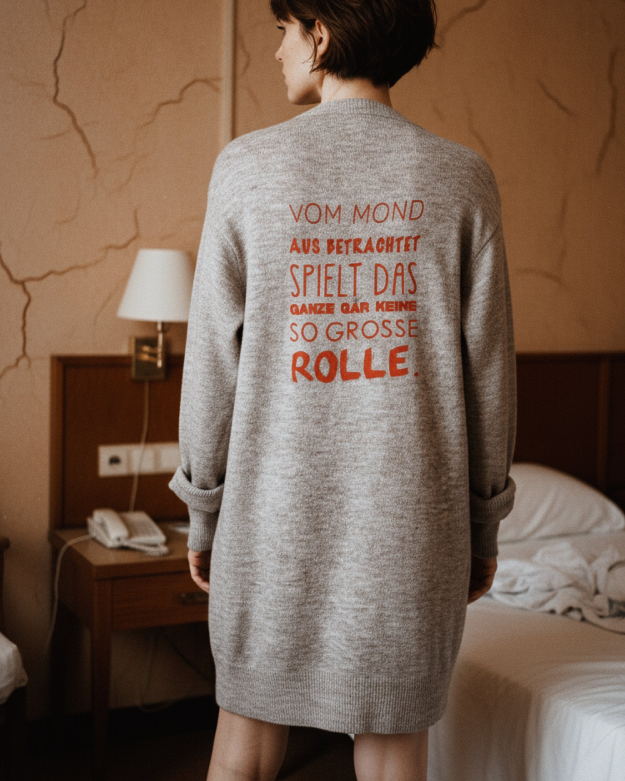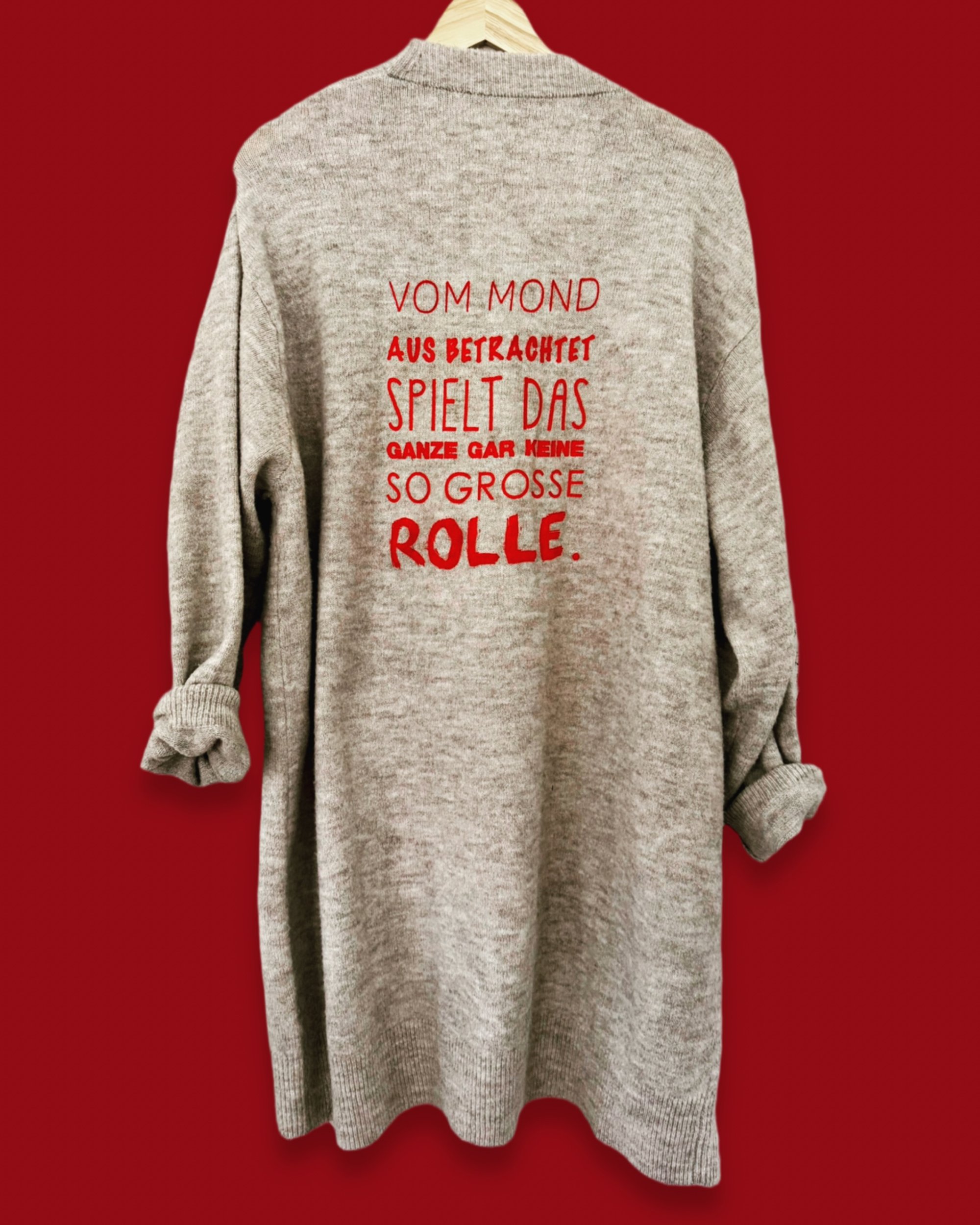 Auf der Rückseite befindet sich ein auffälliger roter Statement-Print, der der Strickjacke eine besondere Wirkung verleiht.