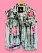 Die Vorderseite ist eine Mischung aus Patches, Pins und Malerei: Smiley, Schlange, Sterne, kleine grafische Elemente und ein gesticktes Statement-Patch. Fransen an den Ärmeln und am Saum geben der Weste diesen typischen, lässigen Festival-Vibe.