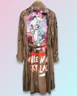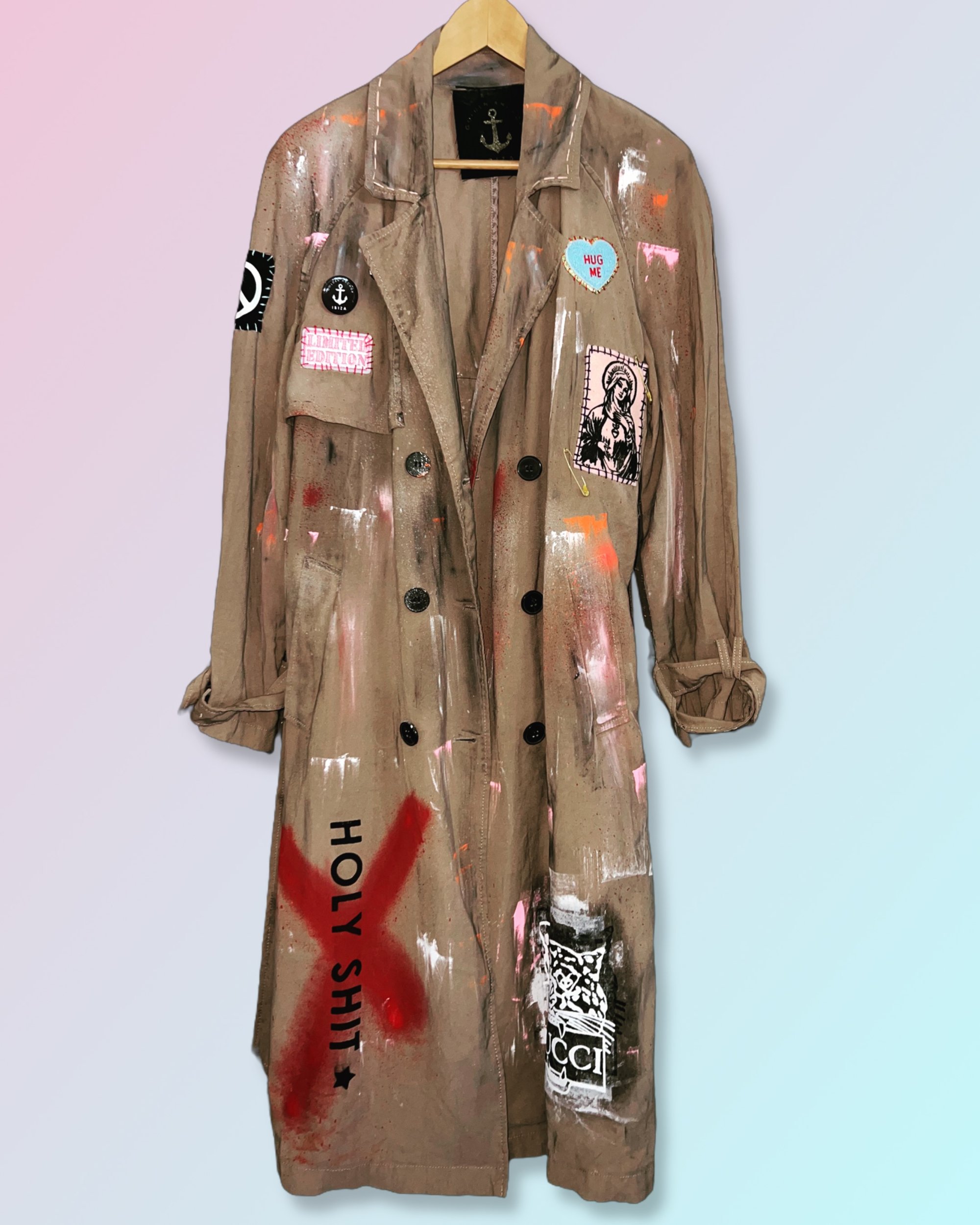Dieser leichte Vintage Trenchcoat besteht aus cappuchinobrauner, weich fallender Baumwolle. „ Handbemalt und verziert mit stencil(s)/ Siebdrucken und Patches.