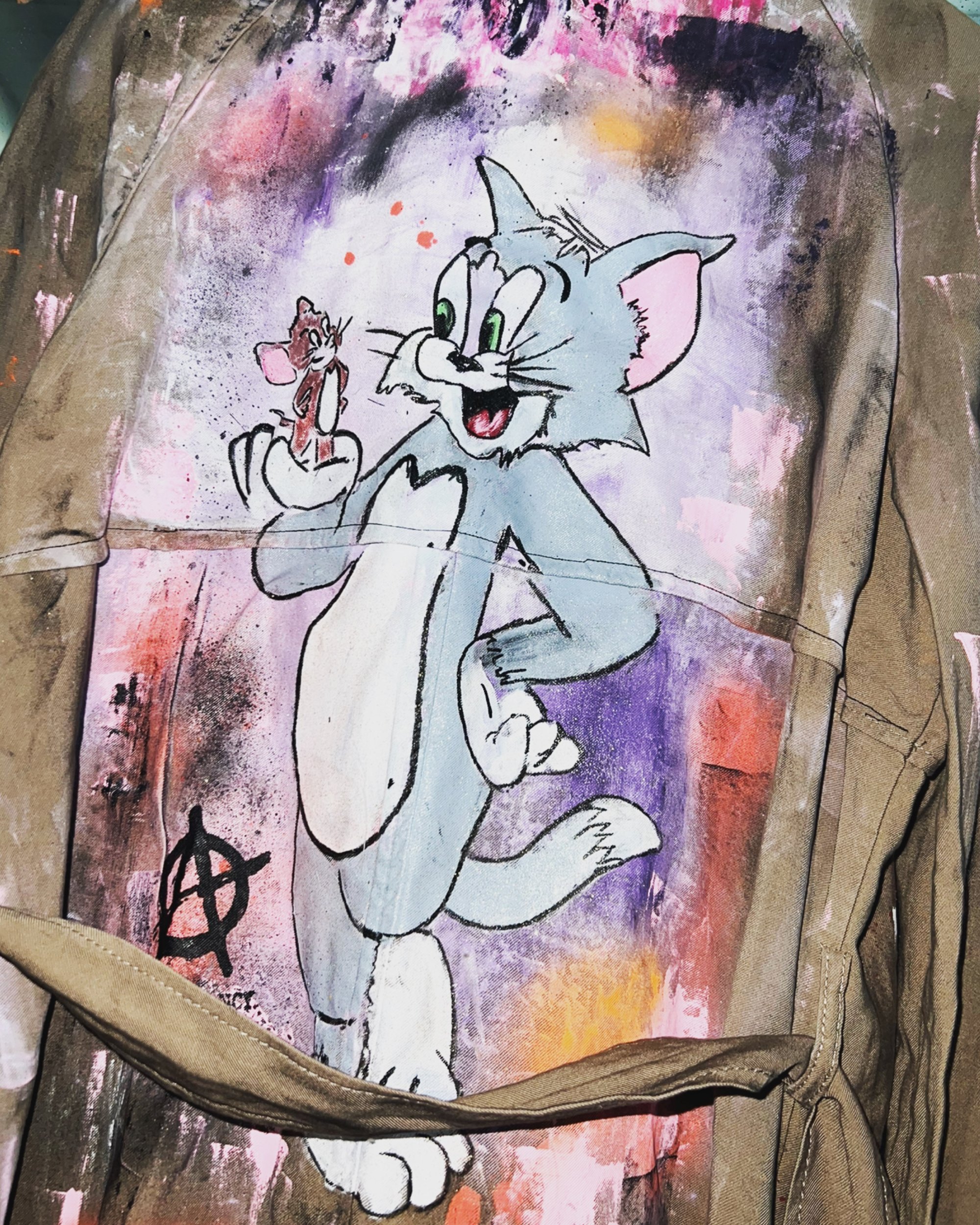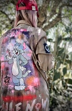• richly decorated with button(s), rivets, patches, stencils & lettering.