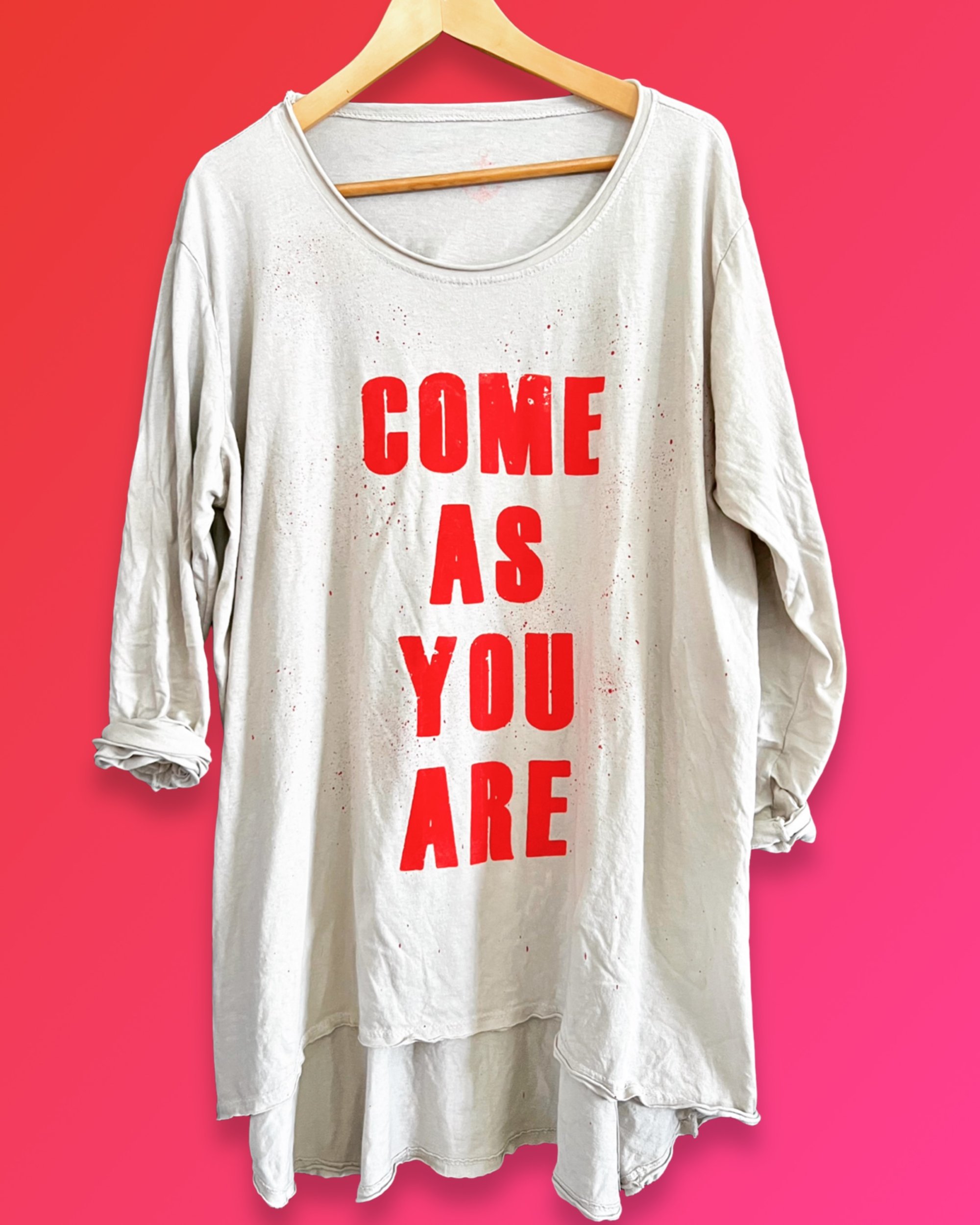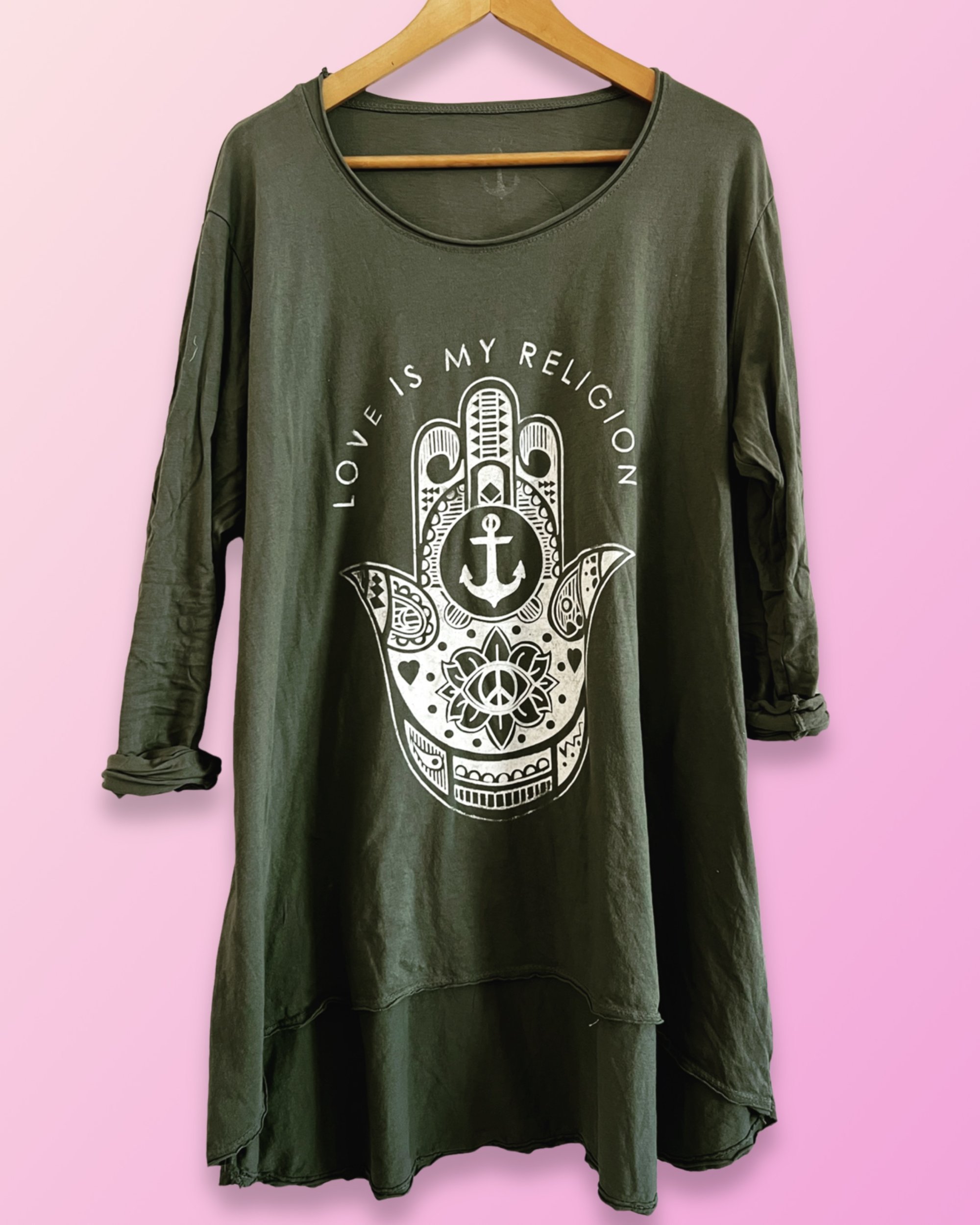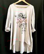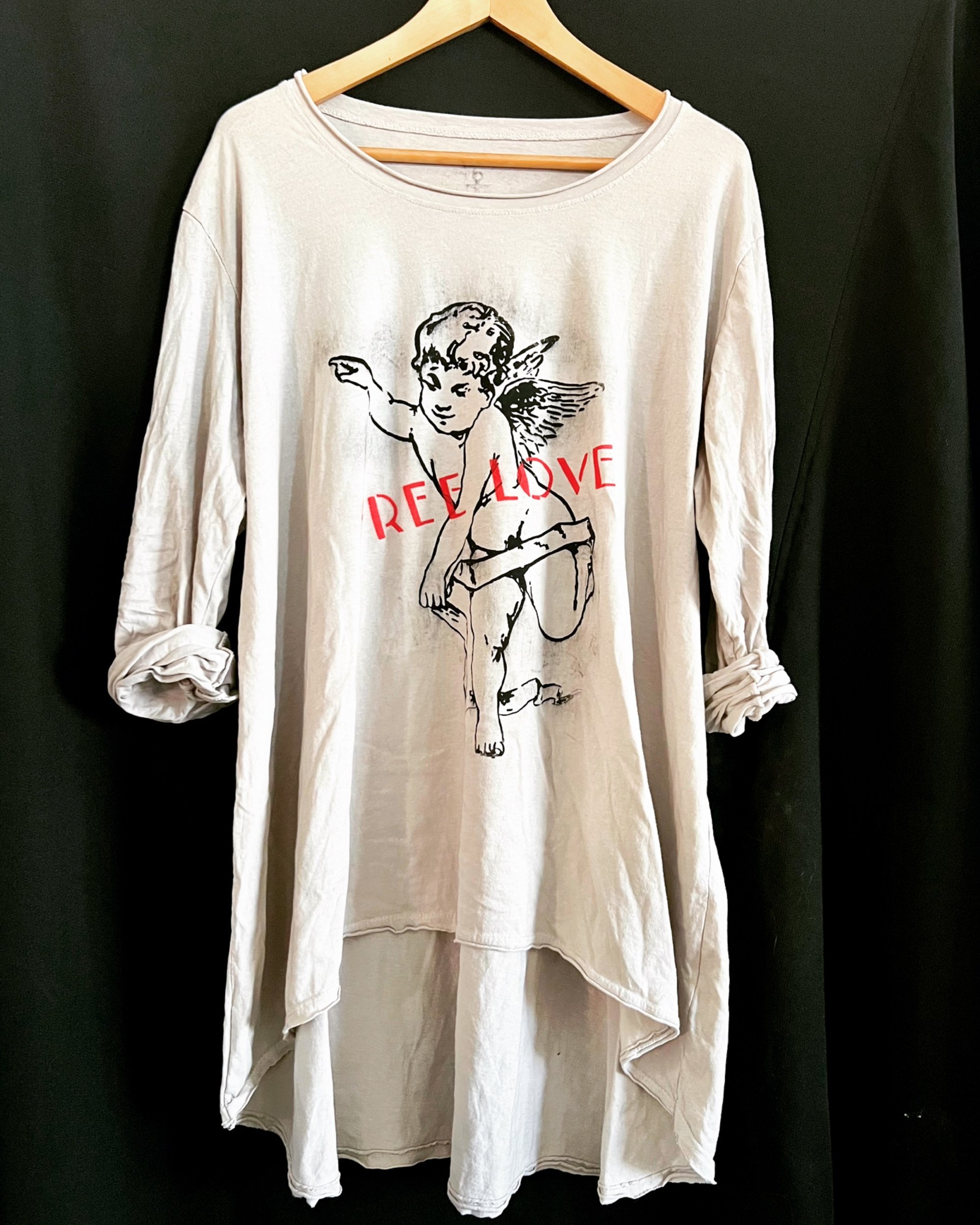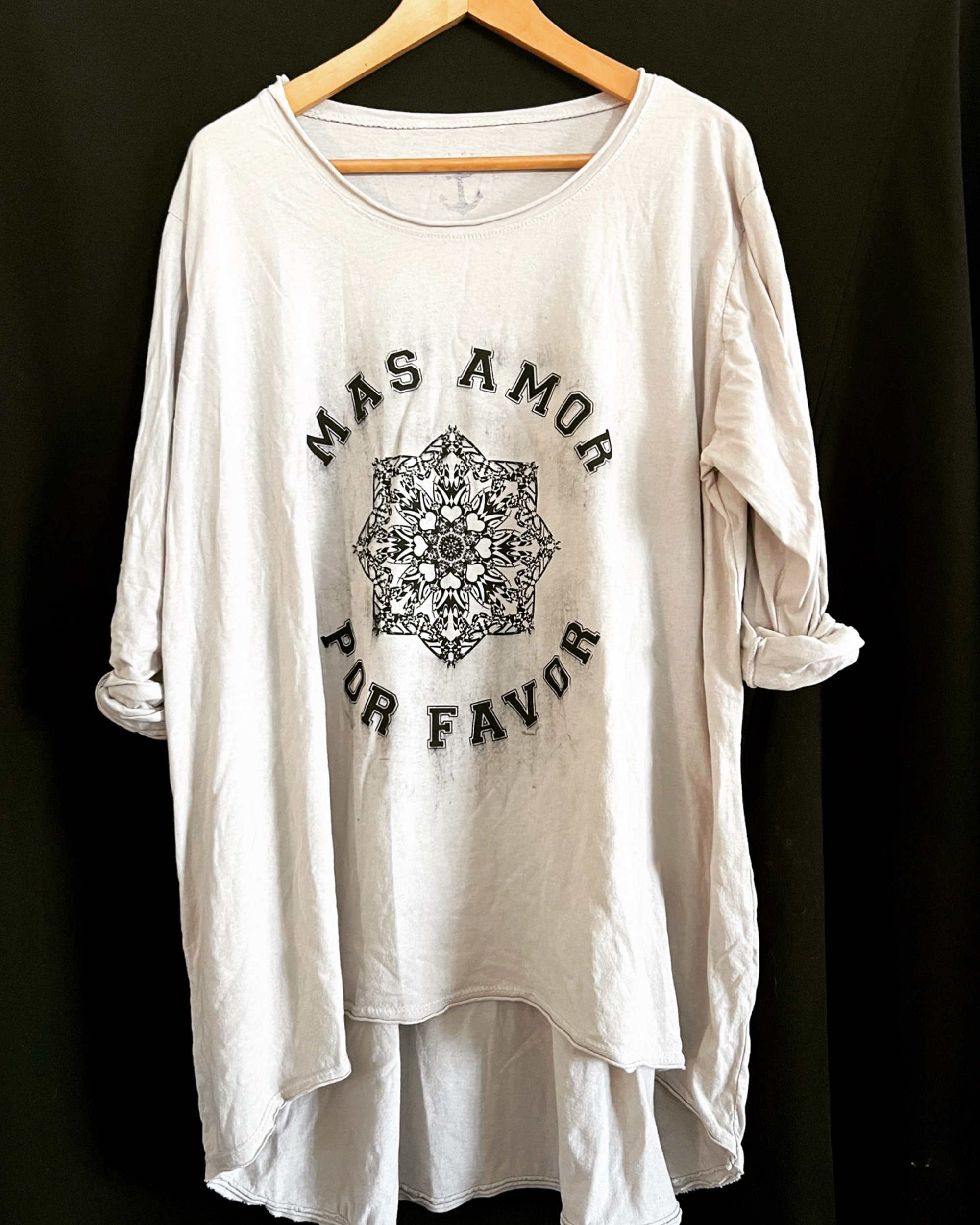 Oversized tshirt ( am Rücken länger geschnitten) aus weich fallender Baumwolle.„ handgemachter Schriftzug . PRINTED / PAINTED WITH PASSION IN IBIZA ♻️