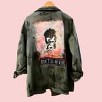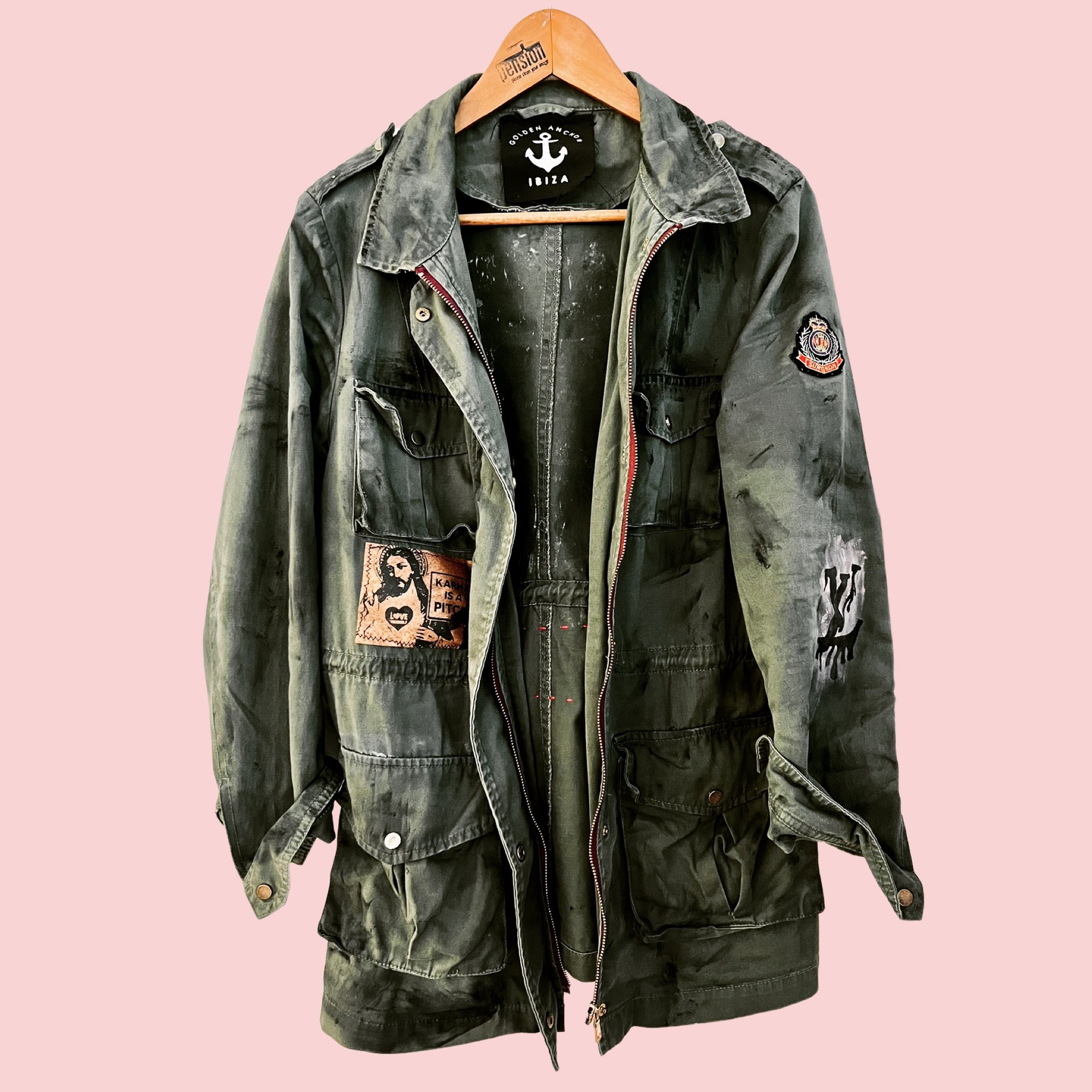 DieserVintage Parkal besteht aus olivgrüner Baumwolle„ Handbemalt und verziert mit stencil(s)/ Siebdrucken und Patches.