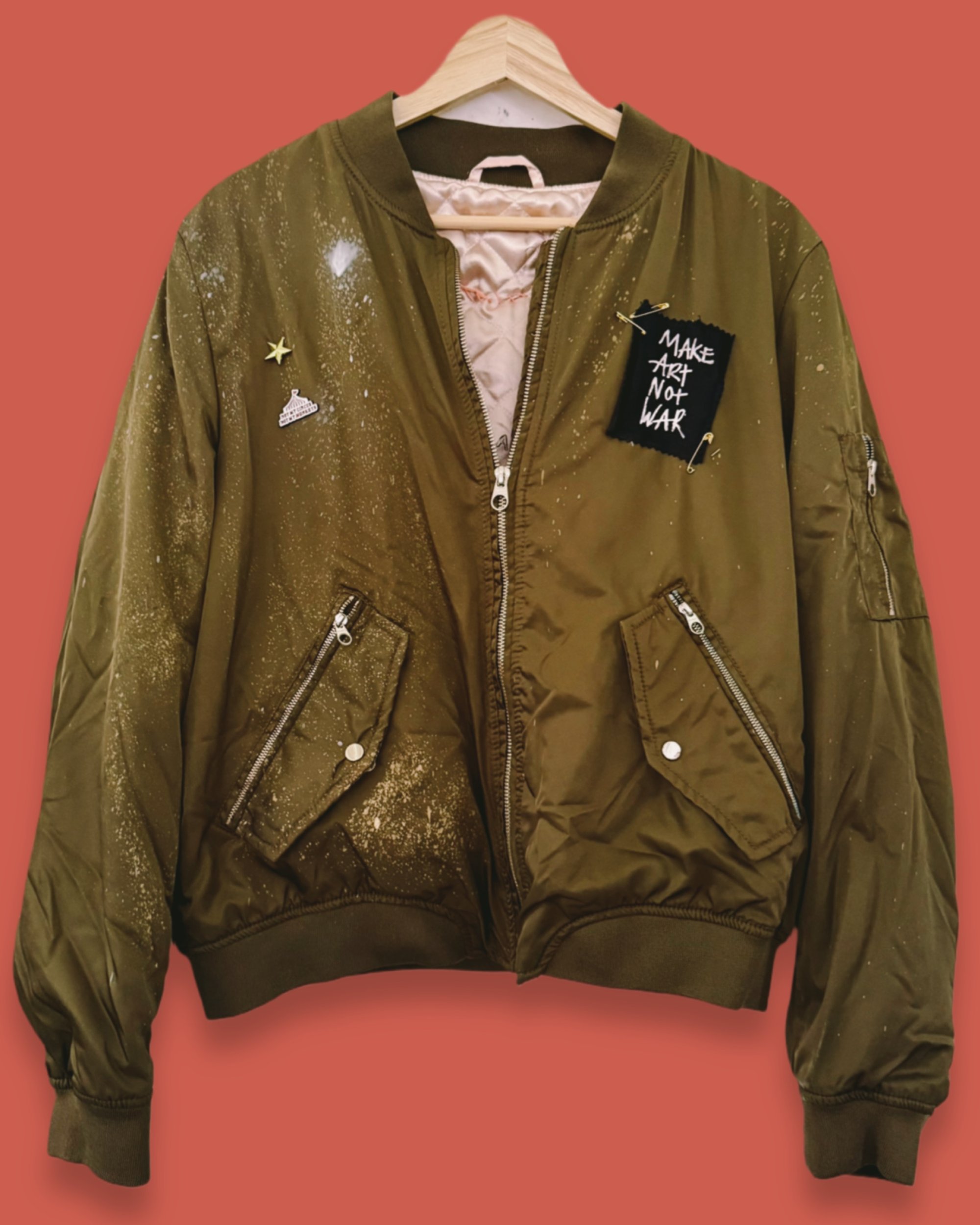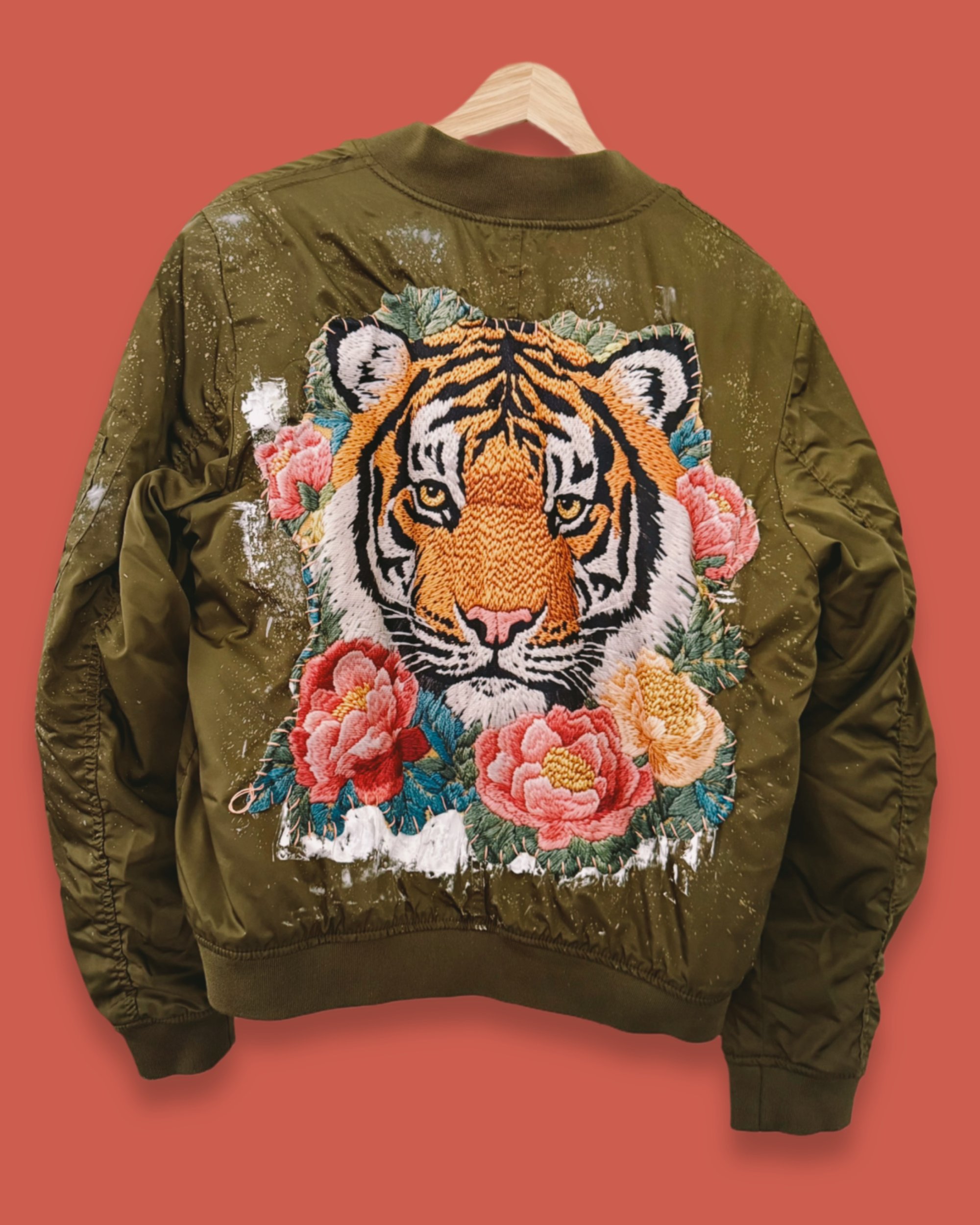 Diese grüne Vintage-Bomberjacke wurde auf Ibiza von Hand veredelt und trägt auf dem Rücken ein kraftvolles Tiger-Motiv. Der Patch ist bewusst roh eingefasst, mit auffälligen Kontraststichen von Hand aufgenäht, und geben der Jacke einen typischen urbanen, unperfekt Look.