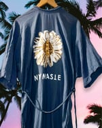 Lässiger Boho Kimono, wahlweise in schwarz/khaki/beige/graublau oder fliederfarbener Baumwolle. Am Rücken mit Patch und/oder Druck verziert. Flechtbindegürtel