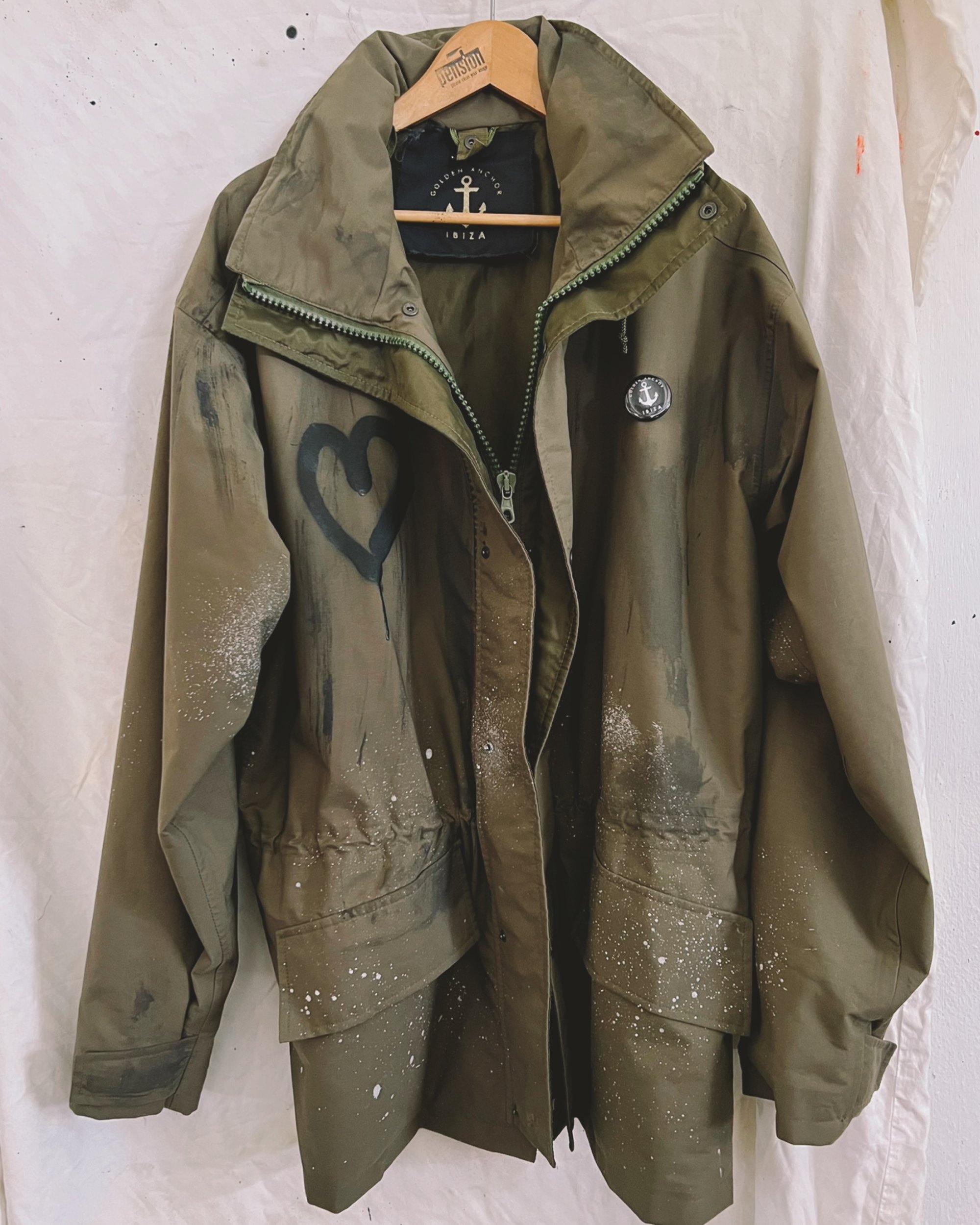 Perfekt für den Übergang ) besteht aus wasserabweisendem Stoff . Herausnehmbare Kapuze - verziert mit stencil(s)/ Siebdrucken und Patches. 1x verfügbar in Grösse XL (fällt grosszügig aus)